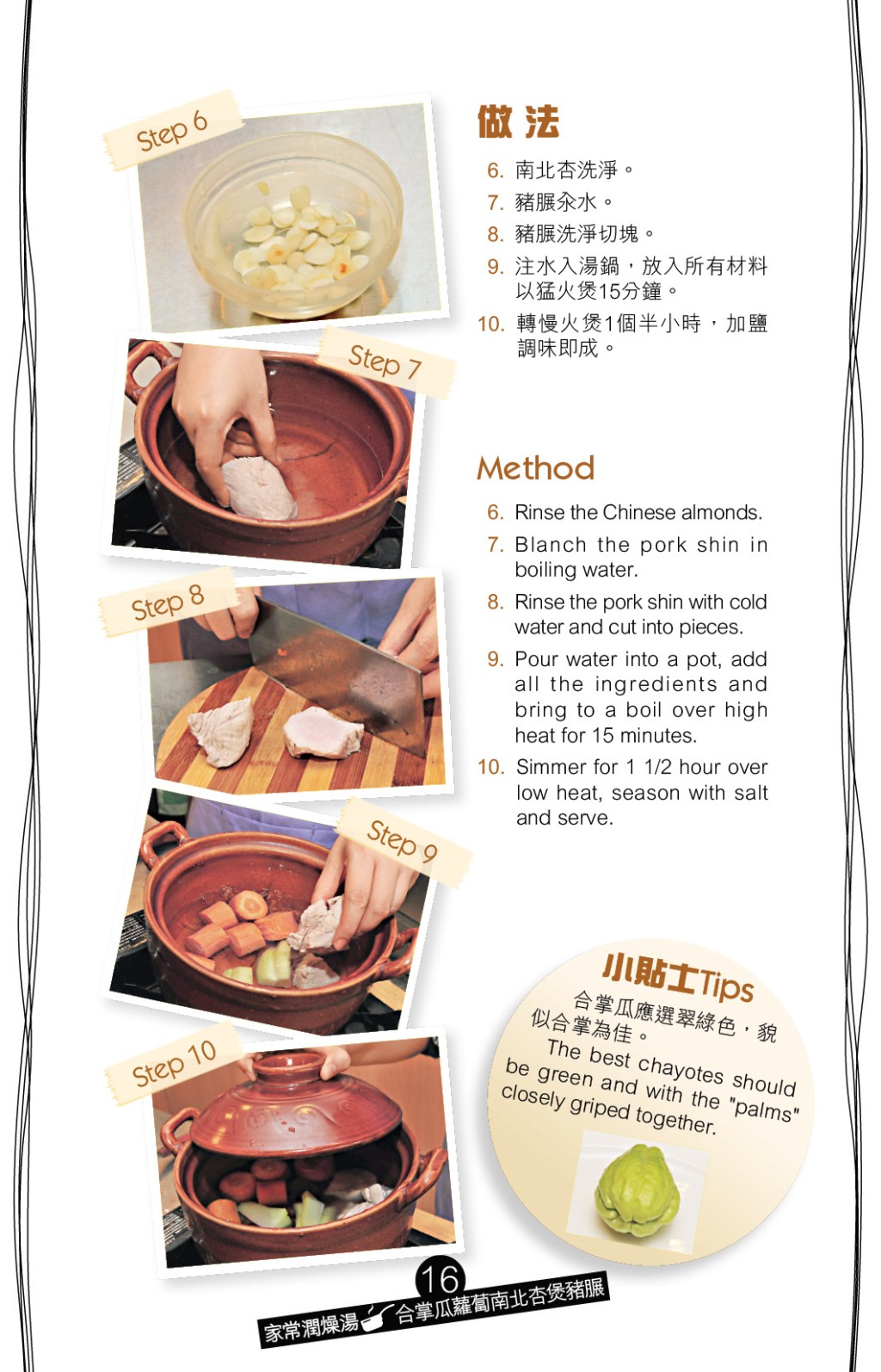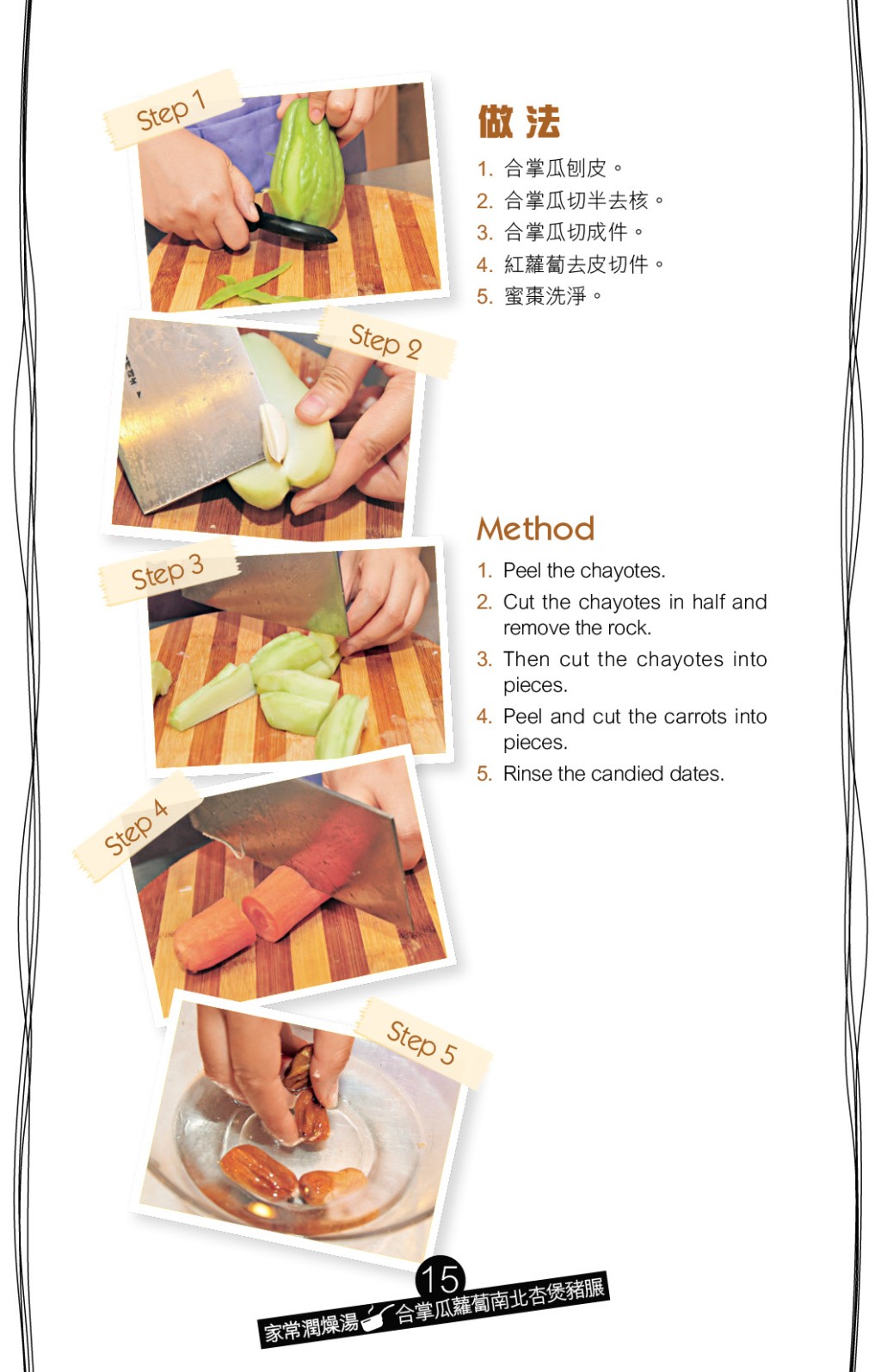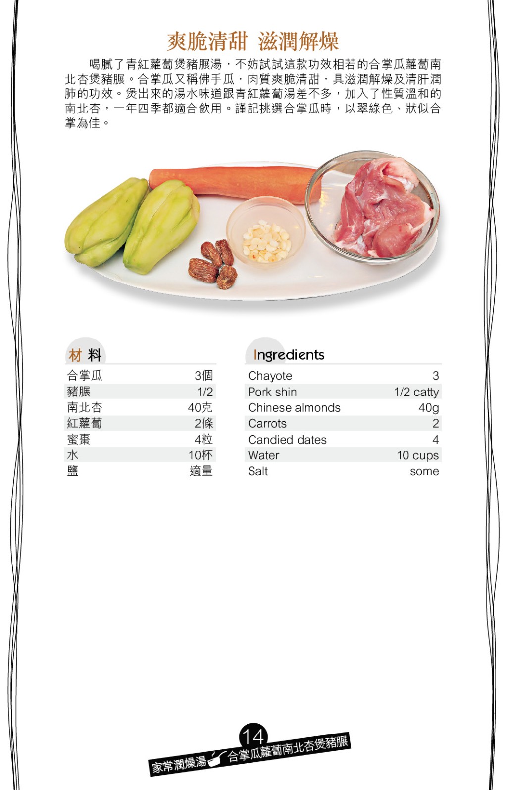 合掌瓜又稱佛手瓜,瓜肉清甜爽脆,具有滋潤解燥、清肝潤肺的功效,南北杏則能潤肺、止咳、開胃生津,互相配搭煲湯,特別適合秋冬飲用。這款合掌瓜蘿卜南北杏煲豬腱的味道清甜,因加入紅蘿卜、蜜棗提升甜味。挑選合掌瓜宜揀翠綠色,貌似合掌為佳。