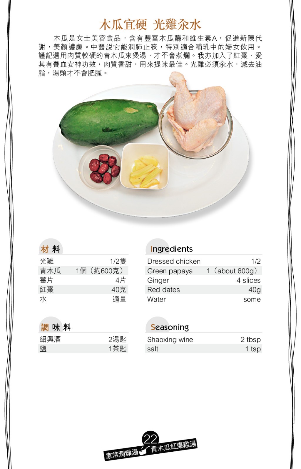 木瓜有美顏護膚的效用,中醫(yī)學上更指木瓜有潤肺止咳之效。紅棗有助養(yǎng)血安神。想減少湯水的油膩,光雞須先汆水及去皮。青木瓜質(zhì)感較硬不易煮爛,適合煲湯,但若想湯水更香甜,也可用熟木瓜入饌。