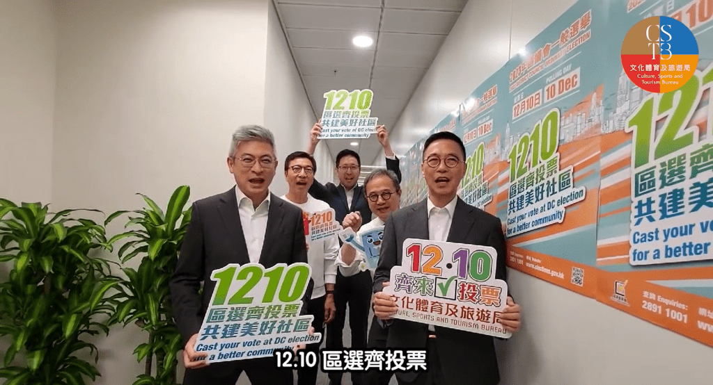 楊潤雄亦在社交平臺發(fā)表影片,片中楊潤雄伙同文體旅局副局長劉震、常任秘書長黃智祖、體育專員黃德森及政治助理招文亮拍片,再次提醒文體旅局同事記得12月10日區(qū)議會選舉投票,而投票當(dāng)日更確保值班的同事可以投票。