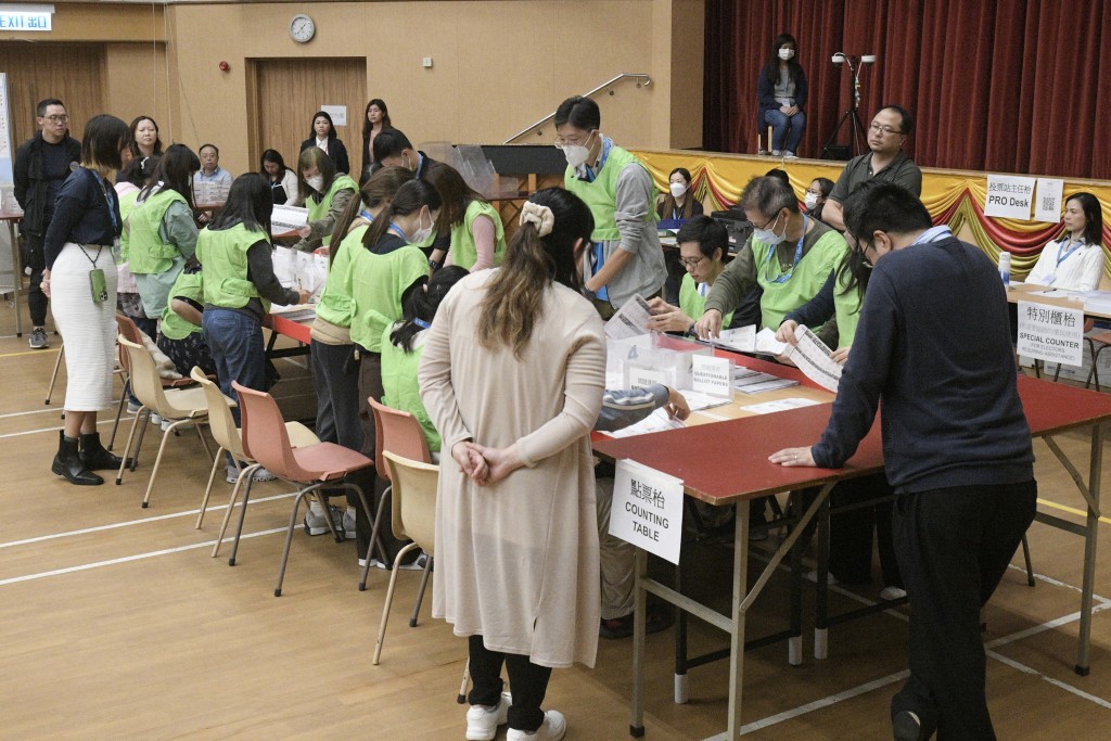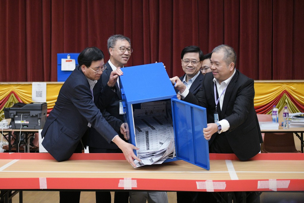 行政長官李家超、陸啟康法官、石丹理教授和文本立資深大律師到香港銅鑼灣高士威道120號皇仁書院點票站巡視及倒出票箱中的選票。
