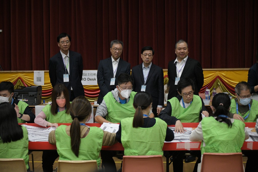 行政長官李家超、陸啟康法官、石丹理教授和文本立資深大律師到香港銅鑼灣高士威道120號皇仁書院點票站巡視及倒出票箱中的選票