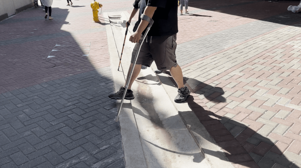 有撐拐杖人士小心翼翼地跨過(guò)坑渠。