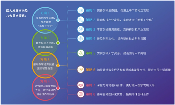 ▲四大方向&八大重點(diǎn)策略。來(lái)源:《香港創(chuàng)新科技發(fā)展藍(lán)圖》, 香港創(chuàng)新科技及工業(yè)局網(wǎng)站。