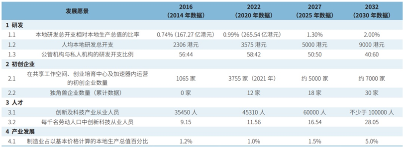 ▲香港科創(chuàng)發(fā)展愿景參考指標(biāo)表。來(lái)源:《香港創(chuàng)新科技發(fā)展藍(lán)圖》