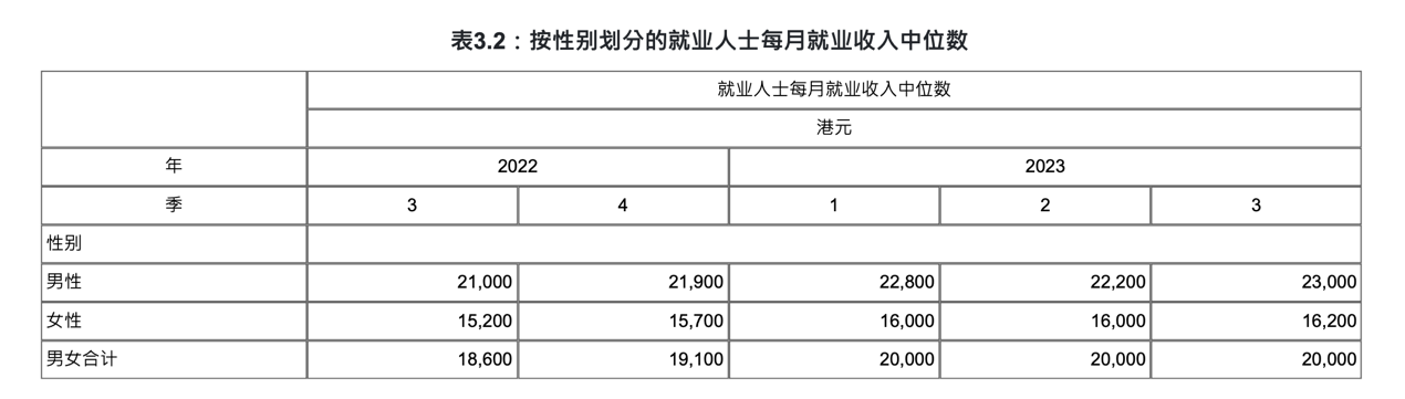 按性別劃分的就業(yè)人士每月就業(yè)收入中位數(shù)。圖源:香港特別行政區(qū)統(tǒng)計處