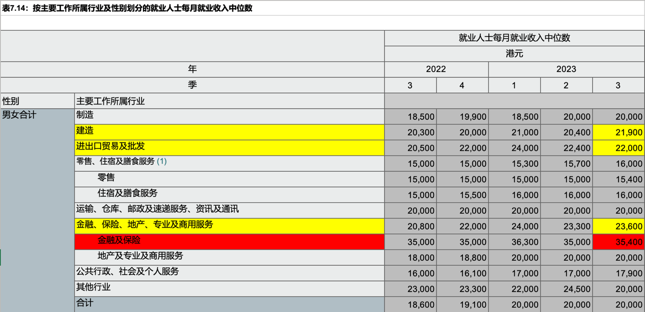 為留住人才,香港企業(yè)也是不遺余力,最直接的就是漲工資!據(jù)最新香港《綜合住戶統(tǒng)計調查按季統(tǒng)計報告》顯示,2023年第3季度,香港打工人每月就業(yè)收入中位數(shù)為2萬港元(約1.82萬人民幣),比去年同期增長約7.5%;7大行業(yè)打工人月收入中位數(shù)超過2萬港元的分別為“建造”、“進出口貿易及批發(fā)”和“金融、保險、地產、專業(yè)及商用服務”,“金融及保險”月收入中位數(shù)甚至高達3.54萬港元(約3.23萬人民幣)!其中建造、金融是港漂工作首選。
