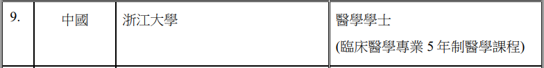 今年港府公布第4批承認醫(yī)學資格的名單,其中有7項醫(yī)學資格來自內地學校,加上過去批次,共有6所內地大學獲承認資格,分別是復旦大學、上海交通大學、中山大學、清華大學、浙江大學和武漢大學。