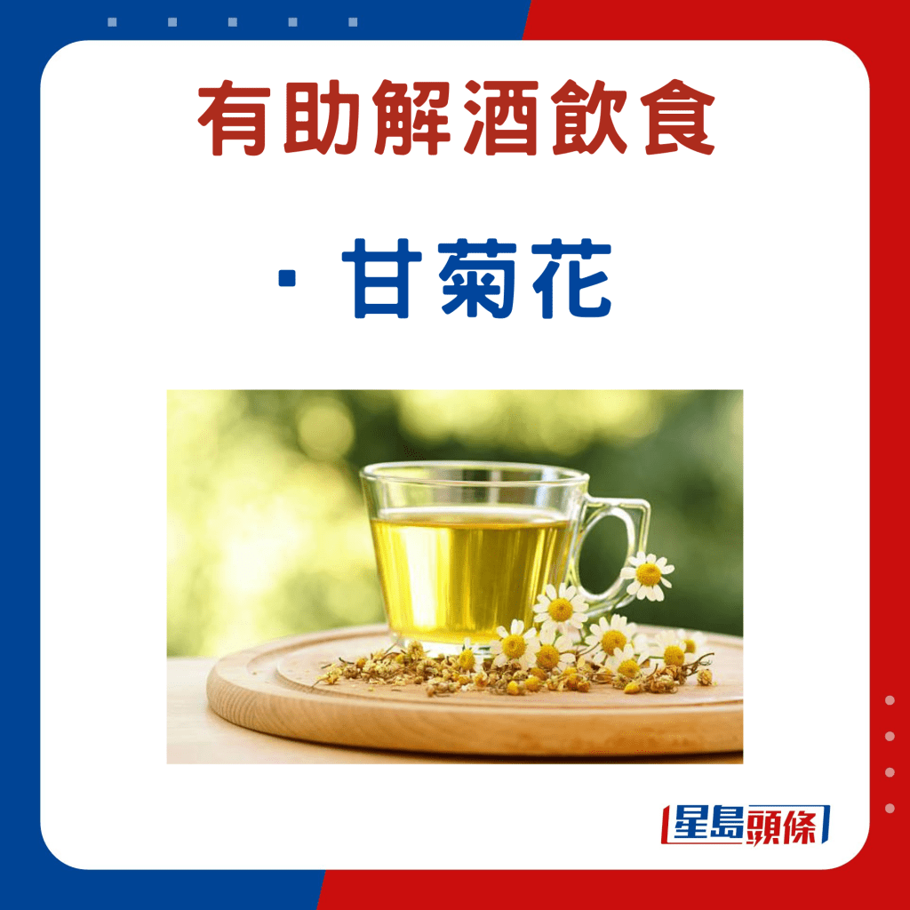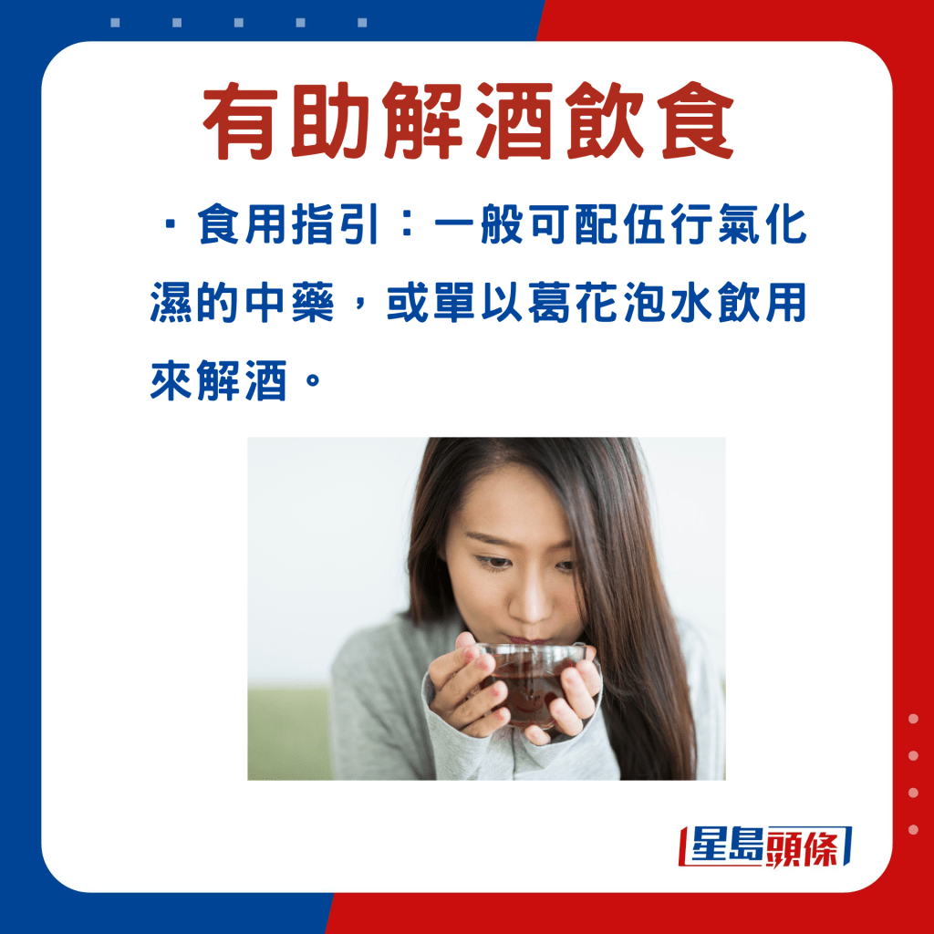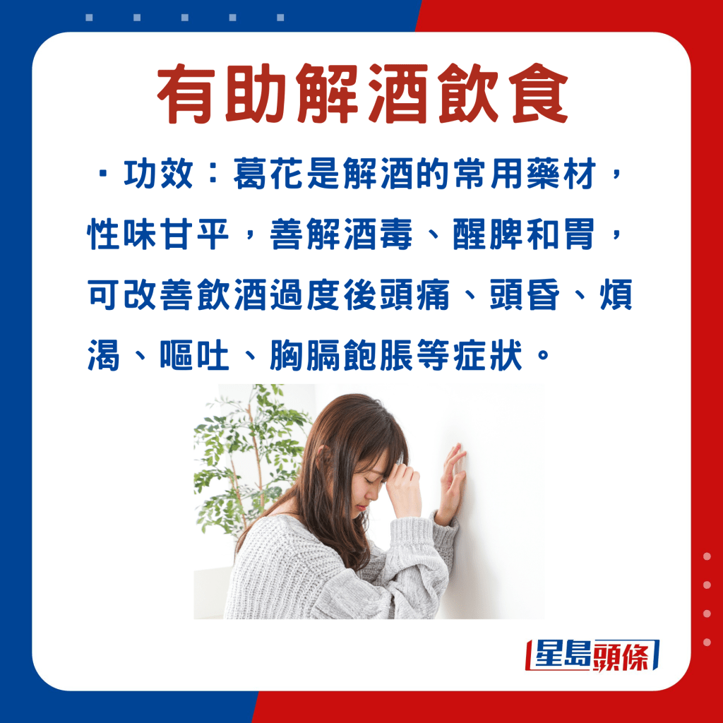 張勇醫(yī)師指,常用的解酒中藥材有葛根、葛花?!案鸶焙写蠖管盏瘸煞?,有助延緩酒精的吸收,減低酒精對肝臟的損害。至于“葛花”,則能解酒、醒脾。現(xiàn)代研究亦發(fā)現(xiàn),葛花含有“異黃酮”,是解酒的主要成分之一。葛花除了解酒效果良好,對于酒精性肝損傷亦起著保護作用。