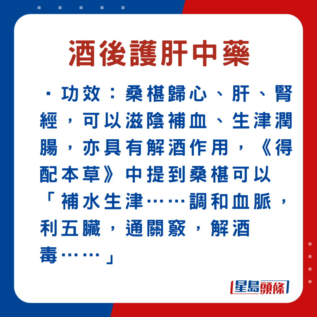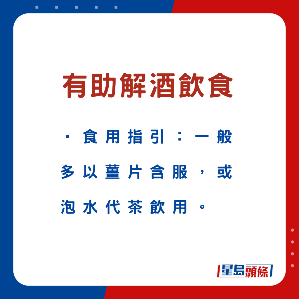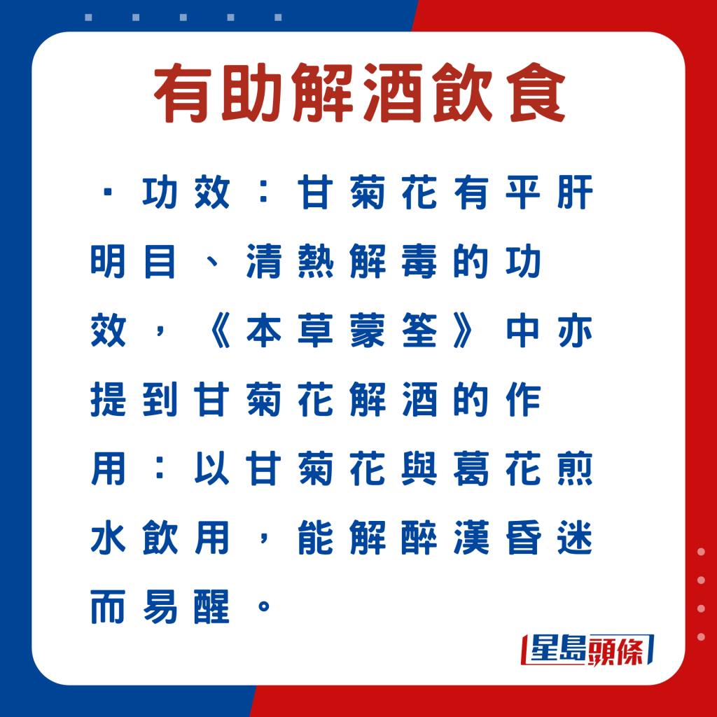 張勇醫(yī)師指,常用的解酒中藥材有葛根、葛花?!案鸶焙写蠖管盏瘸煞?,有助延緩酒精的吸收,減低酒精對肝臟的損害。至于“葛花”,則能解酒、醒脾。現(xiàn)代研究亦發(fā)現(xiàn),葛花含有“異黃酮”,是解酒的主要成分之一。葛花除了解酒效果良好,對于酒精性肝損傷亦起著保護作用。