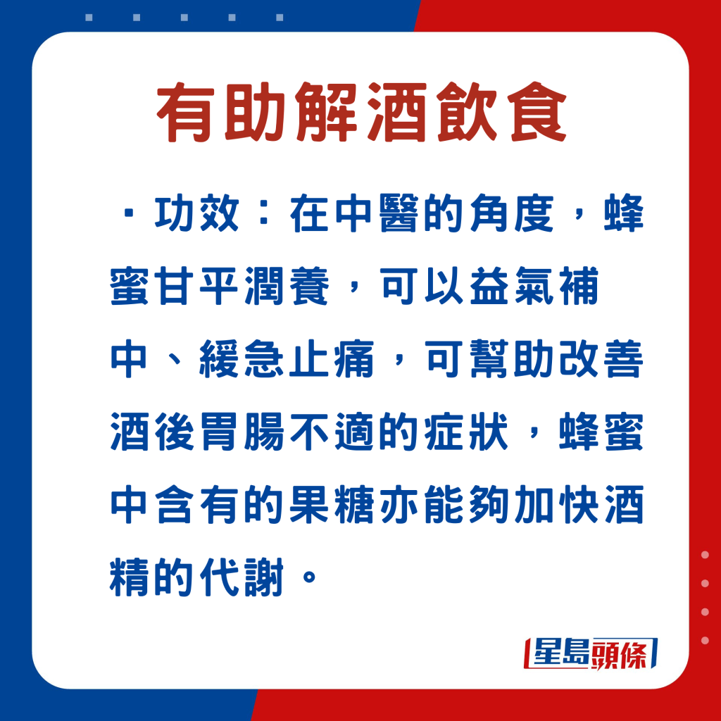日常飲食中,部分食物有助緩解醉酒不適。中藥材亦含很多抗氧化成分,能保護肝臟,減少因為肝臟代謝酒精時所造成的危害。同時,也可以減輕宿醉造成的不良反應(yīng),例如嘔吐、頭暈等。