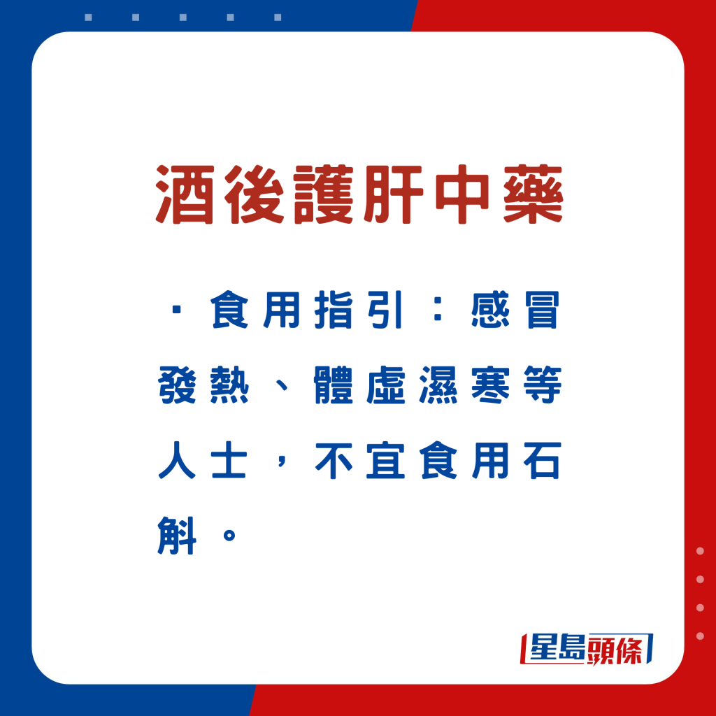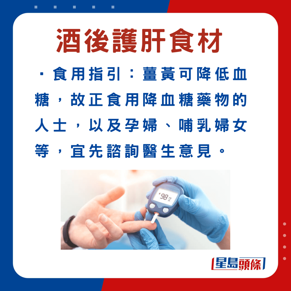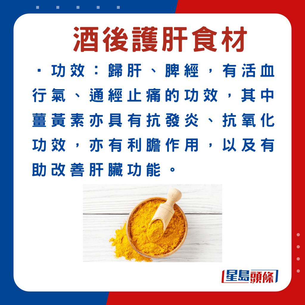 除了中藥材,張勇醫(yī)師還挑選5種日常食材,例如姜黃,有助紓緩酒后不適、護肝臟,建議適量食用。詳細食用指引如下: