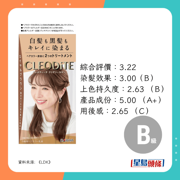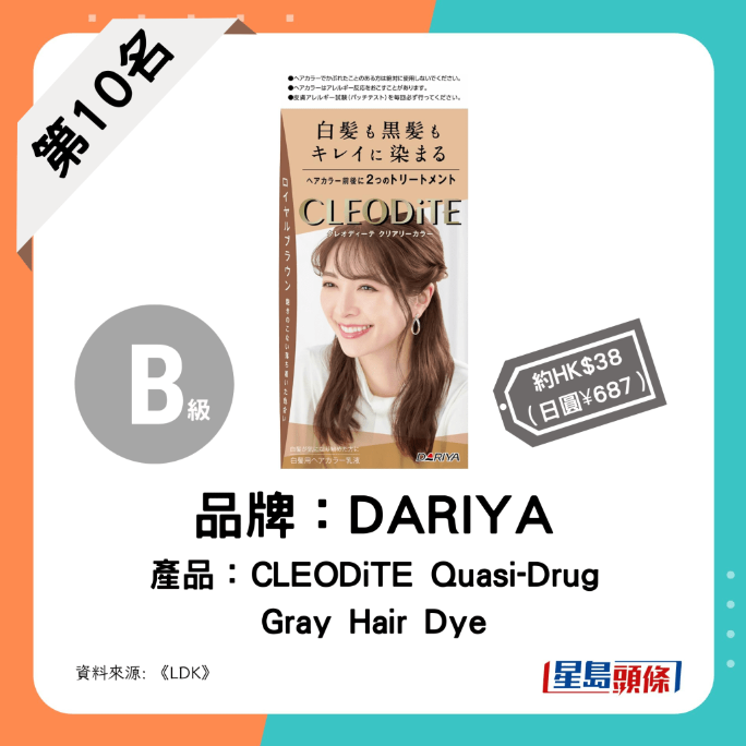 白發(fā)專用染發(fā)劑推介 | 壓力大、熬夜、年紀(jì)增長等因素,均容易令白發(fā)增多。 想用染發(fā)劑掩蓋白發(fā),但又怕頭發(fā)受傷易甩色? 日本雜志《LDK》評測市面10款白發(fā)專用染發(fā)劑,包括“DARIYA SALON de PRO”、“Kao 花王 Blauné”等品牌。 比較染發(fā)劑成分、上色持久度等方面的表現(xiàn)后,有5款被評為A級,效果持久,不傷頭發(fā),最便宜1款僅售488日元(約人民幣¥24)。
