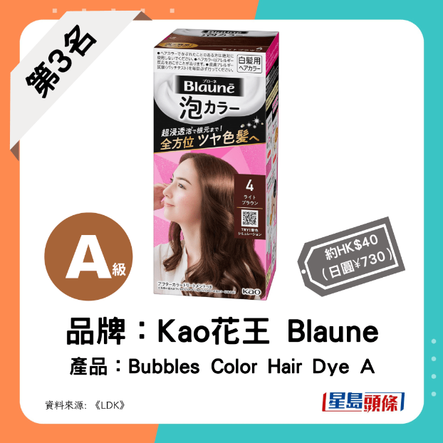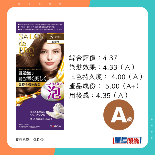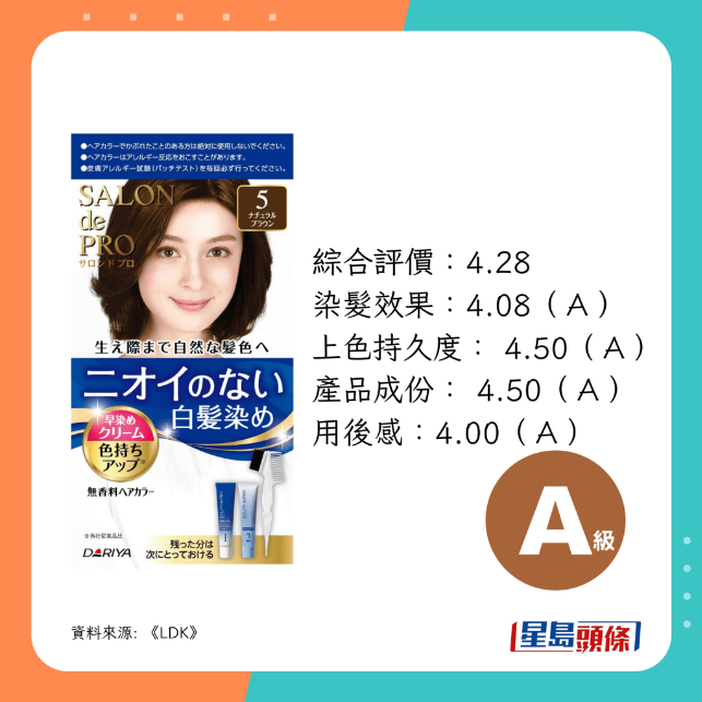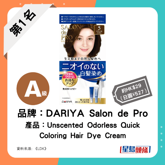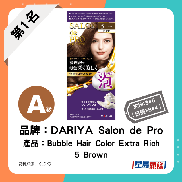這次《LDK》測試中,最獲推介的A級的白發(fā)專用染發(fā)劑同樣為“DARIYA”品牌的產(chǎn)品,分別為“Salon de Pro Bubble Hair Color Extra Rich”及“Salon de Pro Unscented Odorless Quick Coloring Hair Dye Cream”。 兩款產(chǎn)品不但含多種滋潤和修復(fù)頭發(fā)的成分,而且使用方便簡單、上色持久度高。