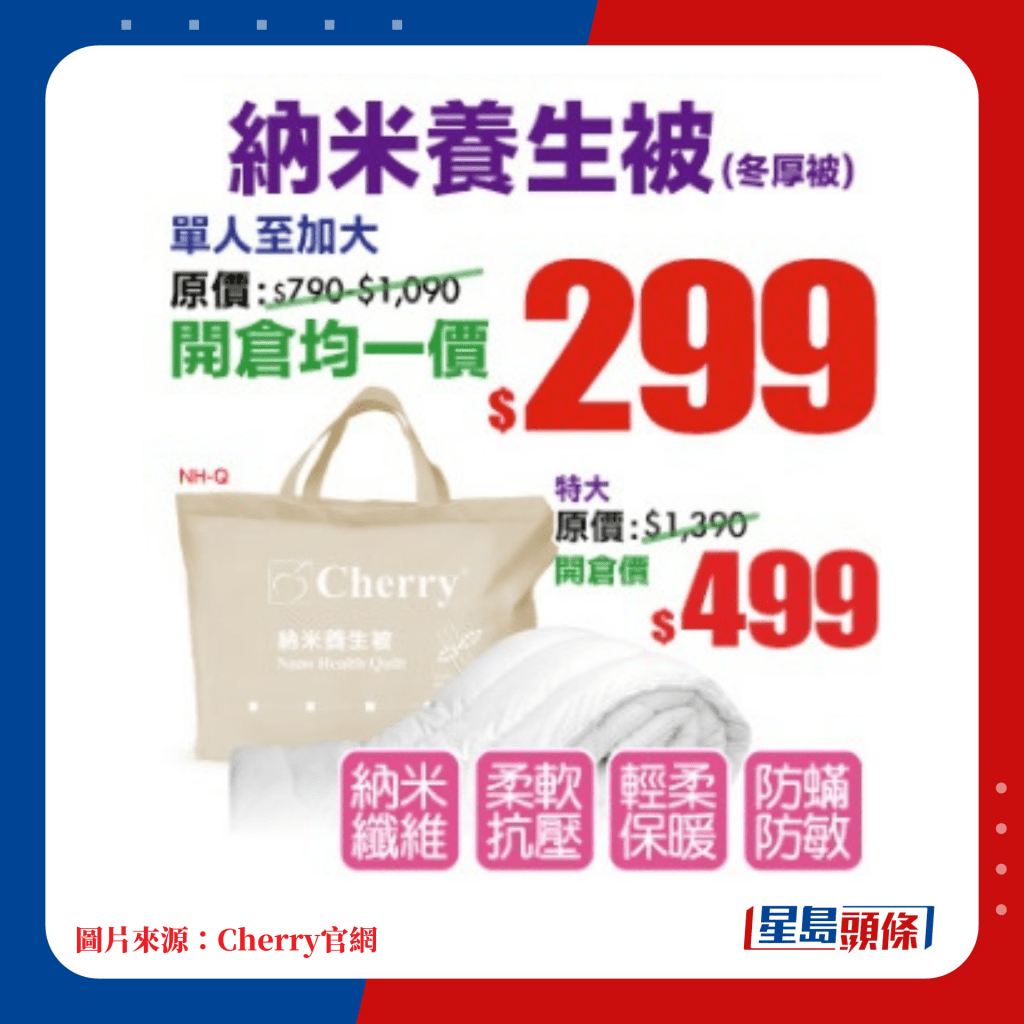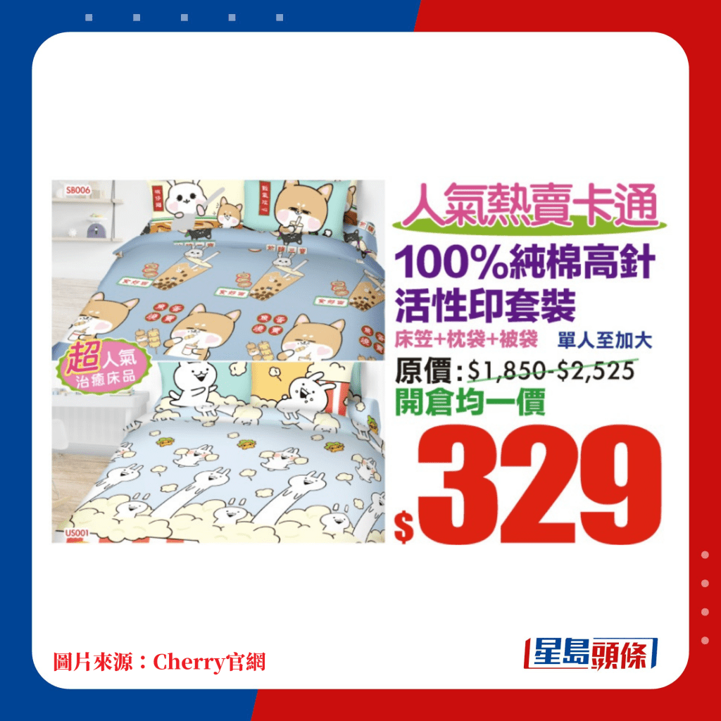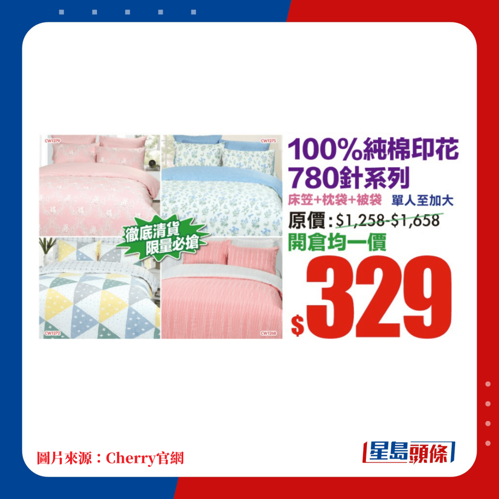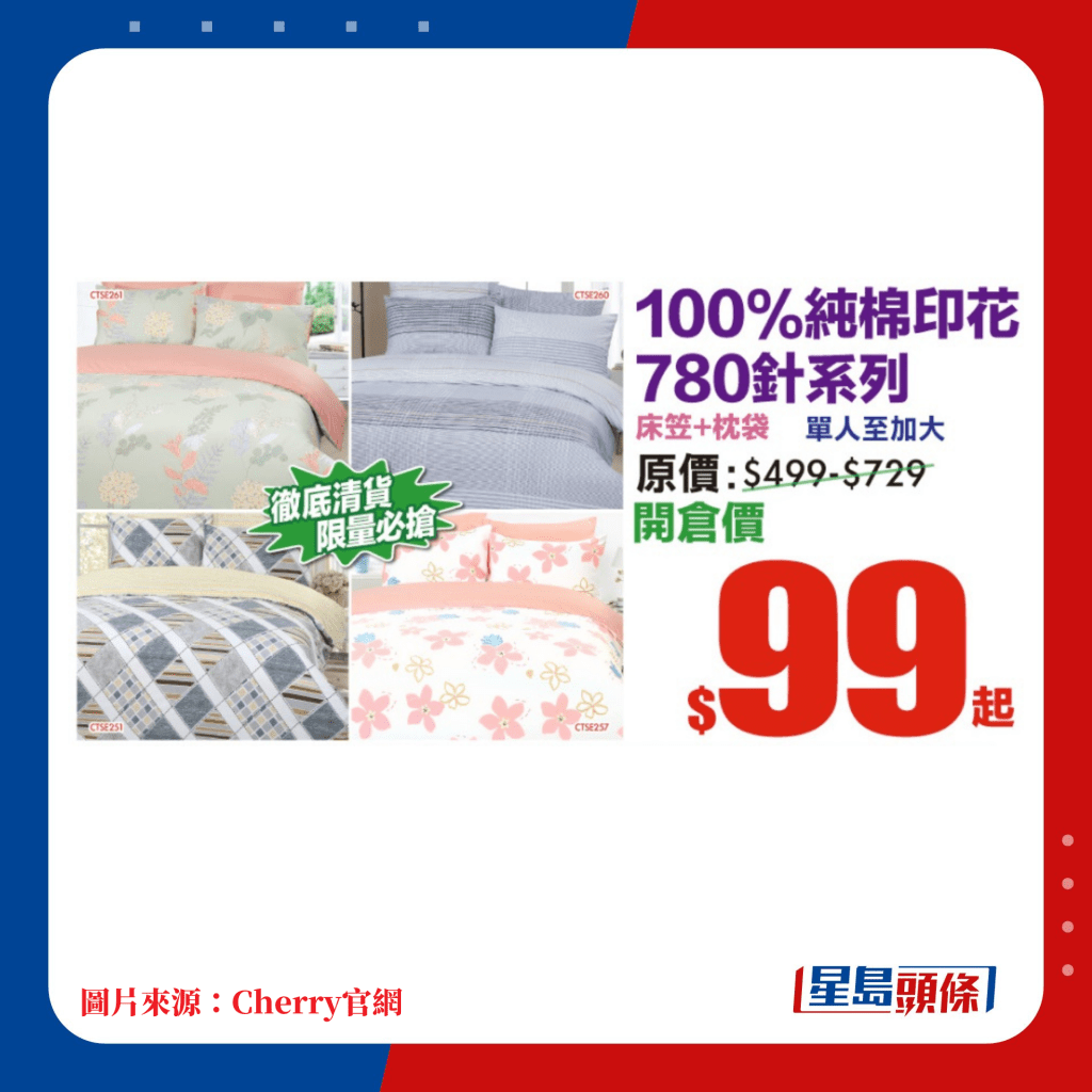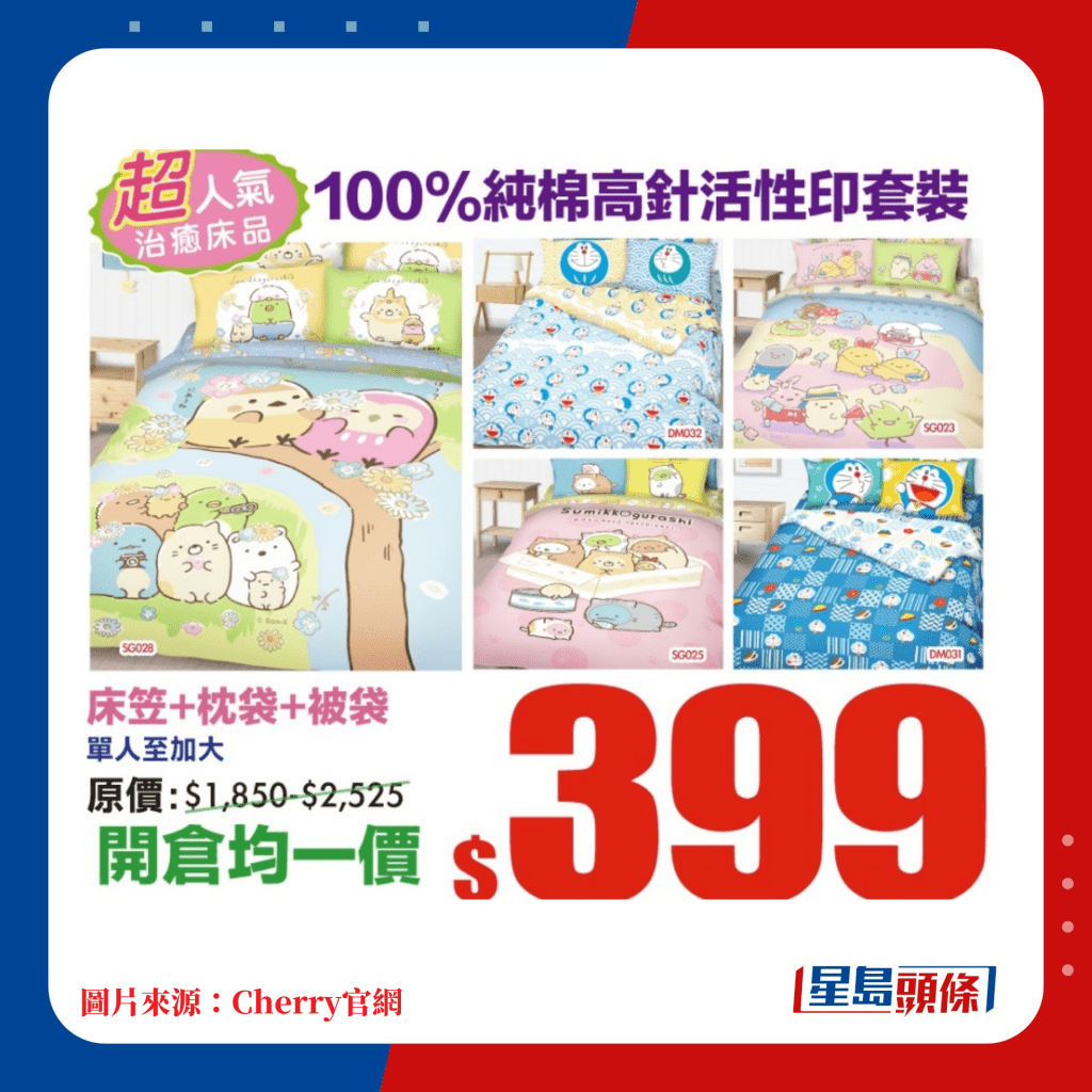 由即日起至明年2月19日,多款Cherry精選床上用品都有減價(jià)優(yōu)惠。當(dāng)中精選推介100%純棉床笠連枕袋套裝,單人至加大尺寸只售$99起; 至于床笠、枕袋及被袋3件套裝,全尺寸均一價(jià)$329。深受小朋友歡迎的卡通系列包括人氣的角落小伙伴、多啦A夢(mèng)各款毛毯、床品3件裝,只售$199起。最近天氣轉(zhuǎn)冷,或許需要添置多一張暖笠笠被鋪,Cherry開倉(cāng)減價(jià)被子包括各款的羊毛被、感溫被、養(yǎng)生被、羽絨被等,售價(jià)由$299起,其中100%純羊毛被由單人至加大尺寸,均一價(jià)只售$499,實(shí)是冬日抵買佳品。