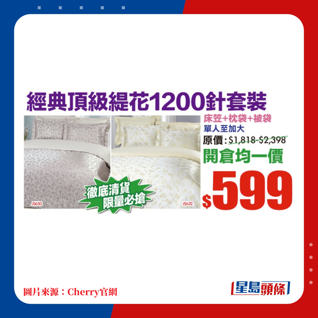 Cherry床品開倉(cāng)|床上用品品牌Cherry由即日起至2024年2月19日進(jìn)行開倉(cāng)大優(yōu)惠,多款床上用品包括床笠、被袋、枕袋大減價(jià)??ㄍ兠薷哚樆钚杂?件套裝均一價(jià)$399,床笠及枕袋$99起,冬日必備的100%純羊毛被開倉(cāng)均一價(jià)$499,溫暖羽絨被劈價(jià)至3折,把握機(jī)會(huì)入手度過(guò)暖笠笠冬天!
