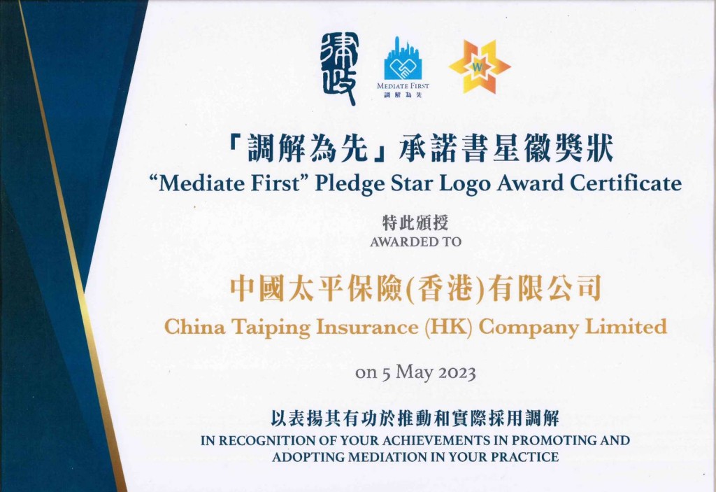 太平香港先后三次獲頒律政司調(diào)解為先承諾書星徽獎(jiǎng)勵(lì)。