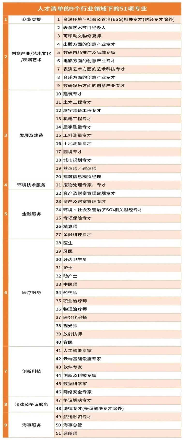 香港特區(qū)政府5月份還擴(kuò)大了“人才清單”,把涵蓋專業(yè)由原有13項(xiàng)增加至51項(xiàng),換句話說,這些崗位都是人手比較緊缺,是較容易審批成功的崗位類型。