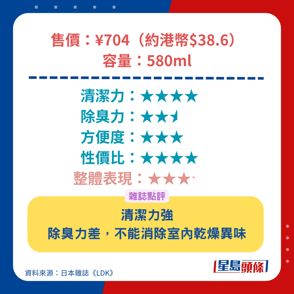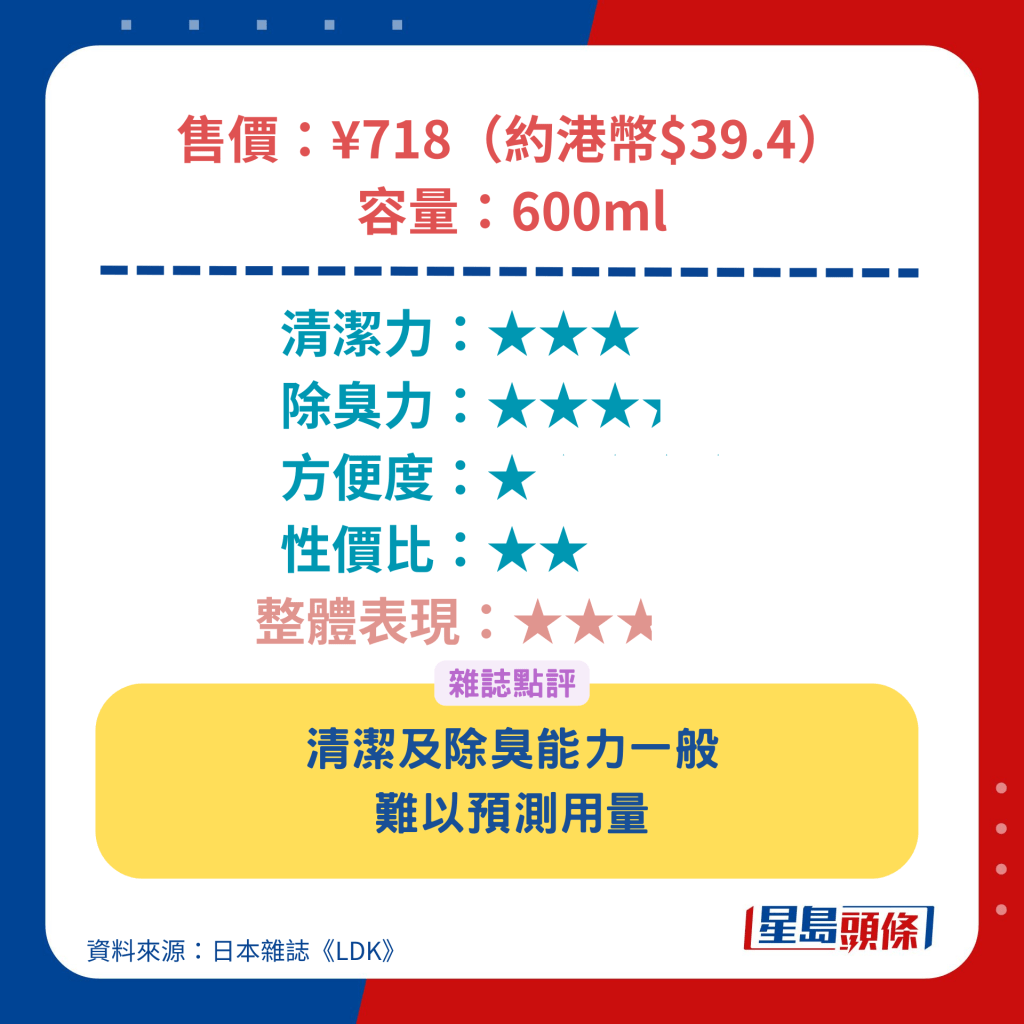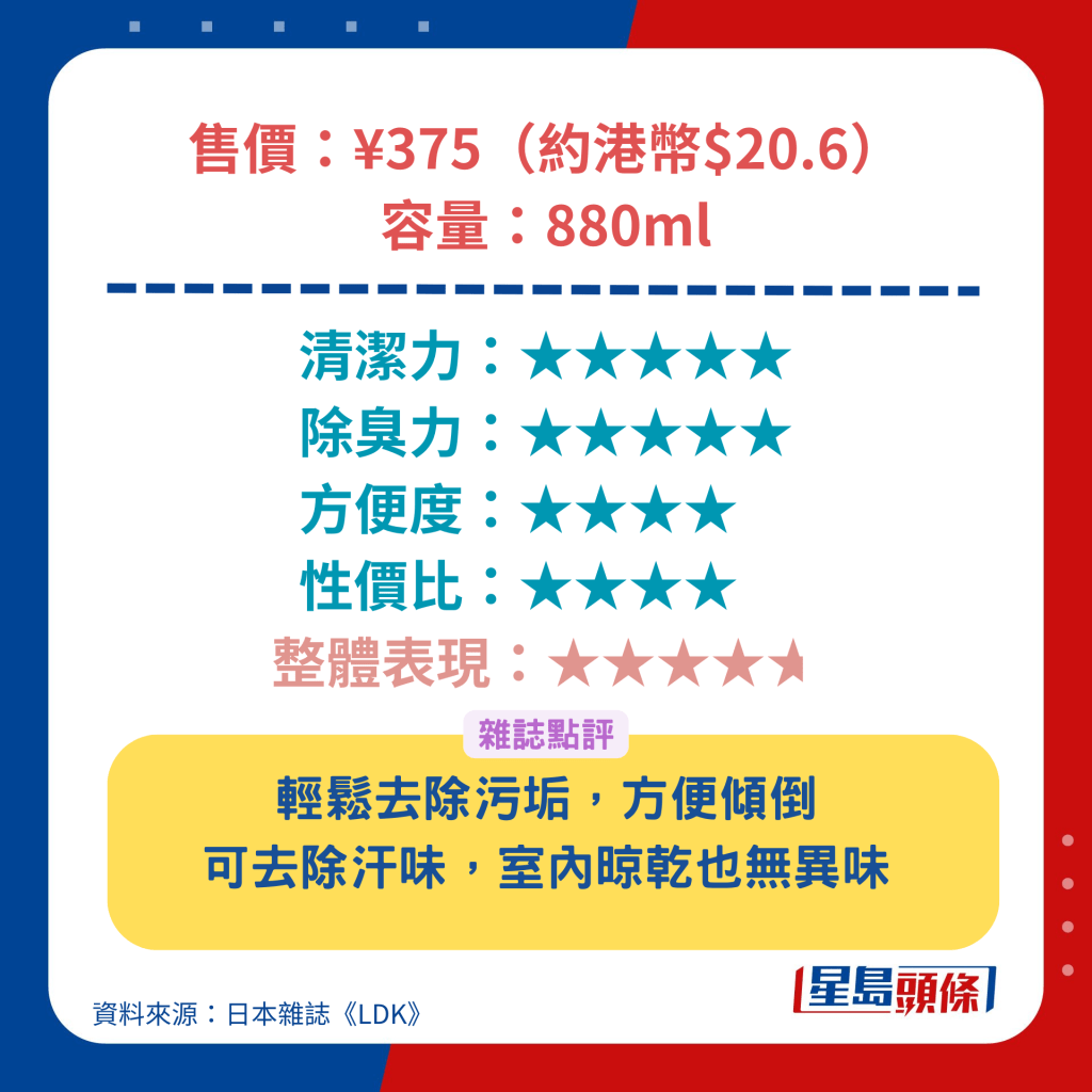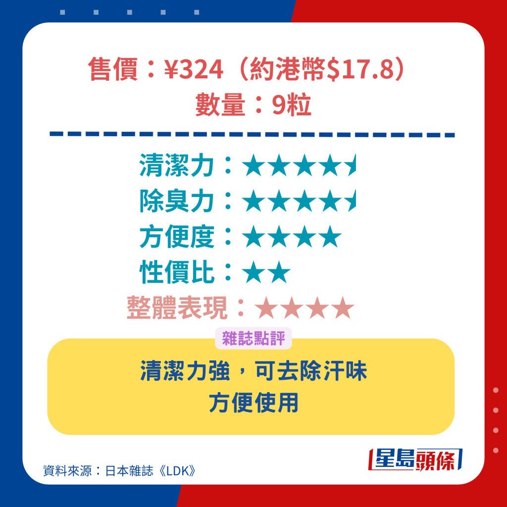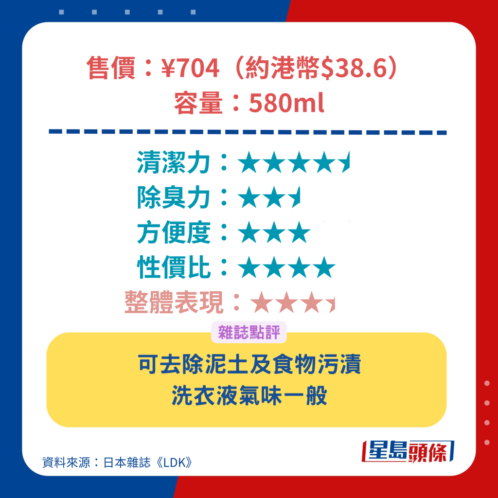 《LDK》就此邀請專家以清潔力、除臭力、方便度及性價比作評分準則(詳細評分準則及測試結(jié)果見上文圖輯),測試了巿面上常見的14款洗衣液及洗衣珠。 結(jié)果顯示獅王“納米樂超濃縮洗衣液”、Ariel“Pro Clean 4D洗衣珠”等5款洗衣產(chǎn)品表現(xiàn)不俗,獲A級評分,具強效清潔,并能夠消除衣服殘留的異味。