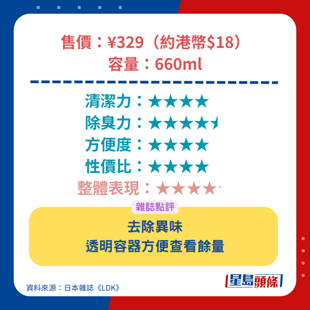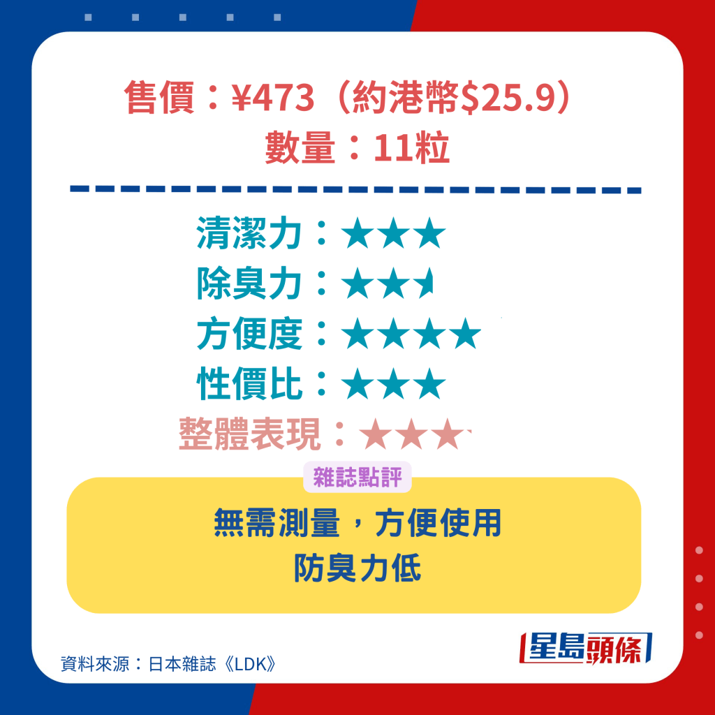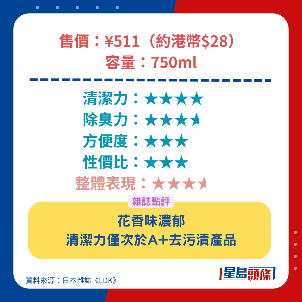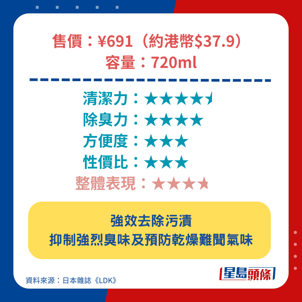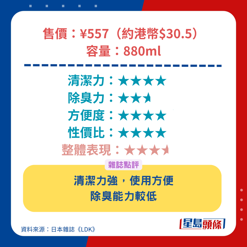 《LDK》就此邀請專家以清潔力、除臭力、方便度及性價比作評分準則(詳細評分準則及測試結(jié)果見上文圖輯),測試了巿面上常見的14款洗衣液及洗衣珠。 結(jié)果顯示獅王“納米樂超濃縮洗衣液”、Ariel“Pro Clean 4D洗衣珠”等5款洗衣產(chǎn)品表現(xiàn)不俗,獲A級評分,具強效清潔,并能夠消除衣服殘留的異味。