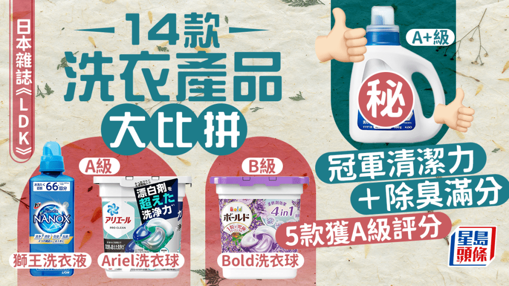 巿面上大部分的洗衣粉、洗衣液及洗衣珠(又稱洗衣球)都標榜著強力清潔、去除污垢異味,甚至抑制汗味等的功效,可是洗衣效果是否真的如產(chǎn)品所述呢? 日本雜志《LDK》找來專家評測14款洗衣產(chǎn)品,其中更包括港人熟悉的花王、獅王、Ariel等品牌。 評測中有多達5款產(chǎn)品獲A級評分,當中表現(xiàn)最佳的洗衣液更低至人民幣19元。