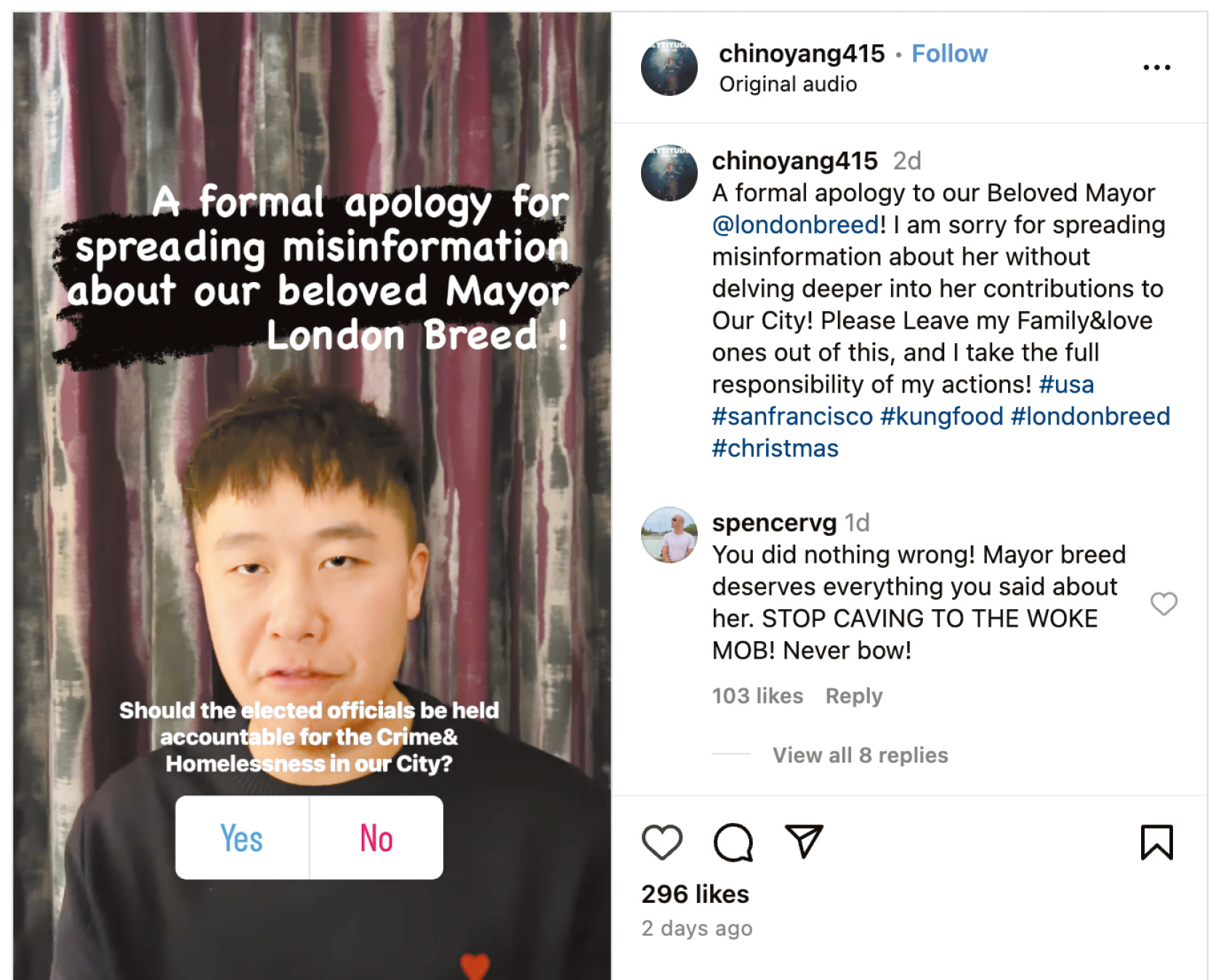 楊曉川在舊金山長大,經(jīng)營的餐廳Kung Food過去三年被盜七次,他因此創(chuàng)作說唱歌曲,抨擊舊金山治安惡化、仇視亞裔激增、零售盜竊頻發(fā)問題,指市長應(yīng)該負(fù)責(zé)。他在歌詞中炮轟“布里德市長你就是一個(gè)小丑”、“用你的中指向市長致敬”、“尤其這些白左根本不在乎華人”。歌曲發(fā)布后在社交媒體擴(kuò)散,并引起主流社會(huì)討論。