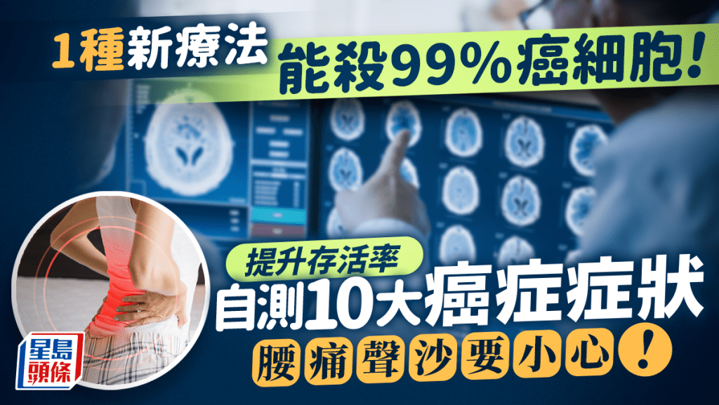 癌癥治療又一新突破!美國(guó)一項(xiàng)最新研究發(fā)現(xiàn),一種新型癌癥治療方法能殺死99%癌細(xì)胞,被視為重大突破。據(jù)統(tǒng)計(jì),港人主要死因的第一位為癌癥(惡性腫瘤),最多人死于肺癌、大腸癌、肝癌。有醫(yī)生教大眾分辨癌癥10大先兆,自測(cè)癥狀,及早發(fā)現(xiàn),以提高存活率,若持續(xù)腰痛、聲沙則要小心!