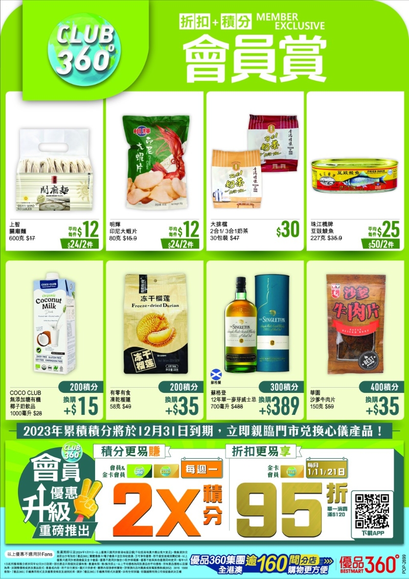 優(yōu)品360 App會員、金卡會員消費(fèi)$1可儲1積分,1,000積分可當(dāng)$10現(xiàn)金折扣,2023年累積的積分到期日至12月31日,逾期積分作廢。2024年1月1日起累積的積分,將于2024年12月31日到期。