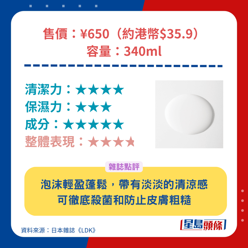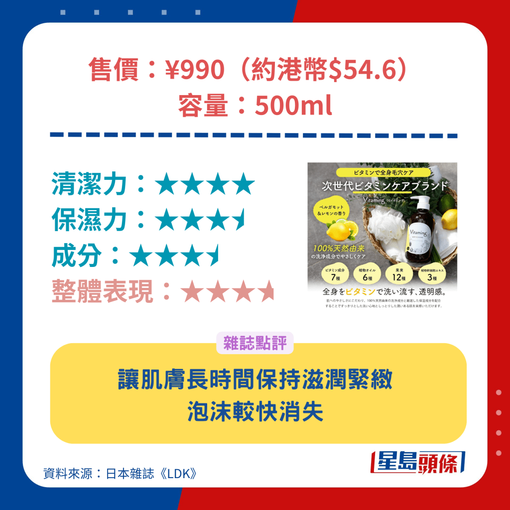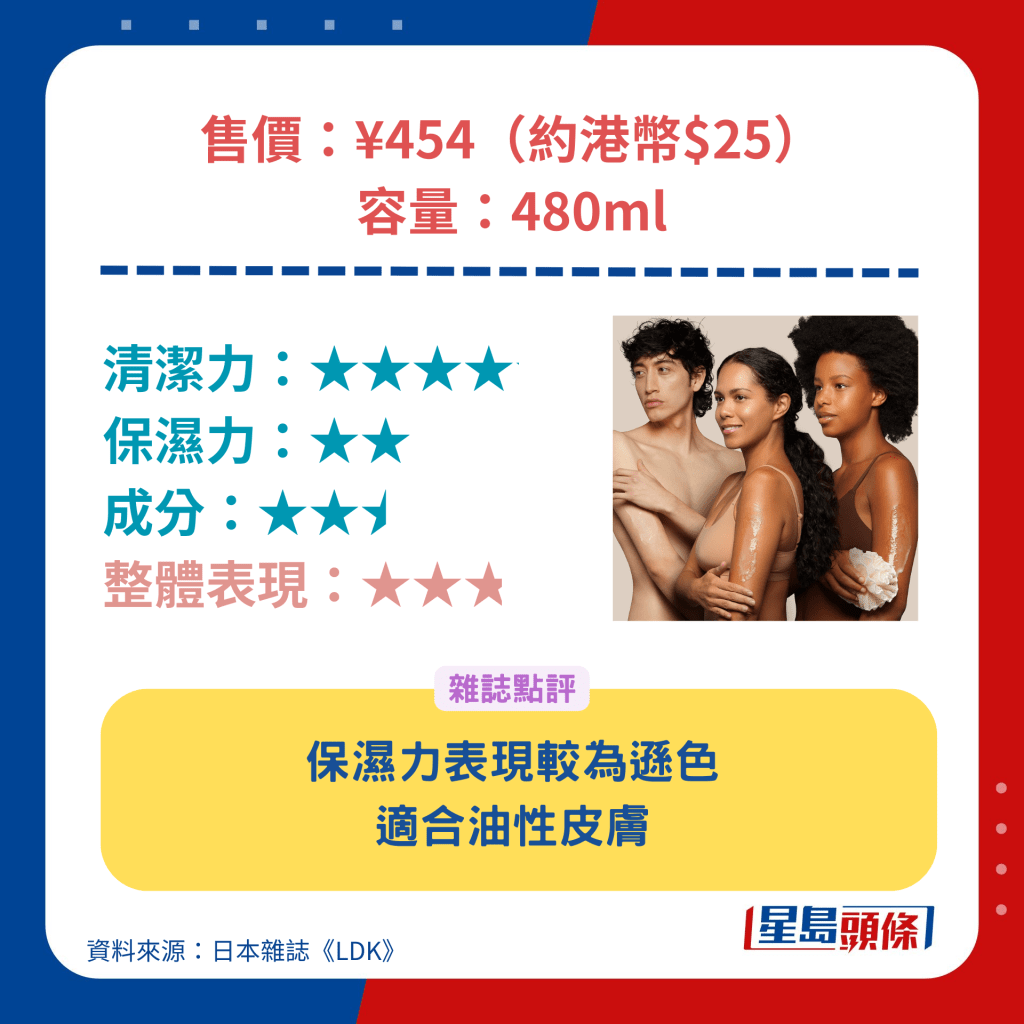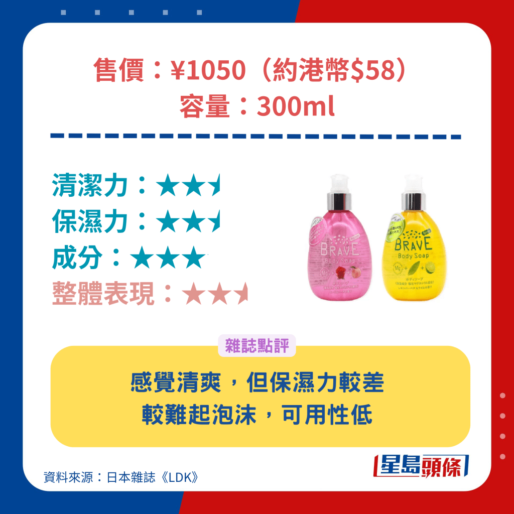 日本知名家品雜志《LDK》就清潔力、保濕力以及成分3大評分準(zhǔn)則,評測巿面上17款平價沐浴露。