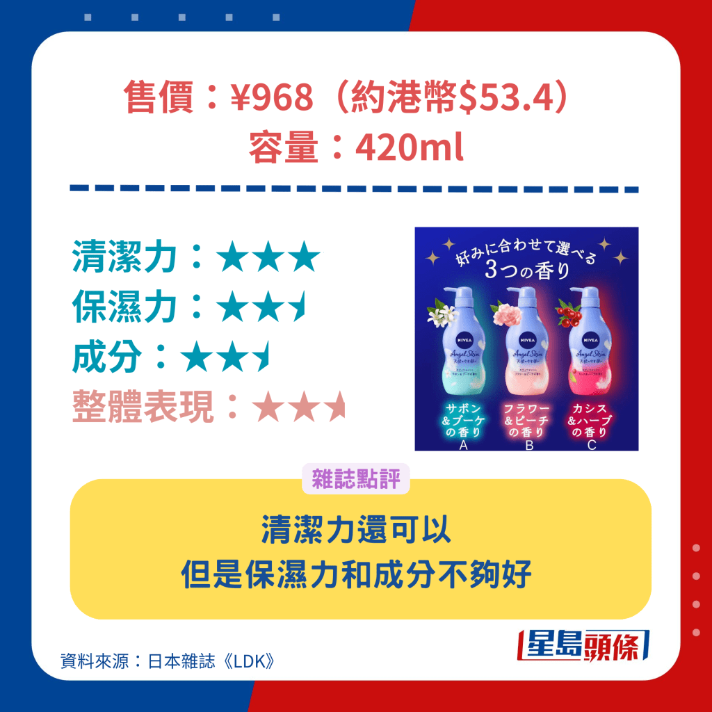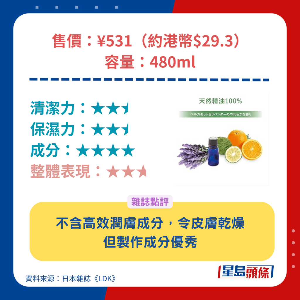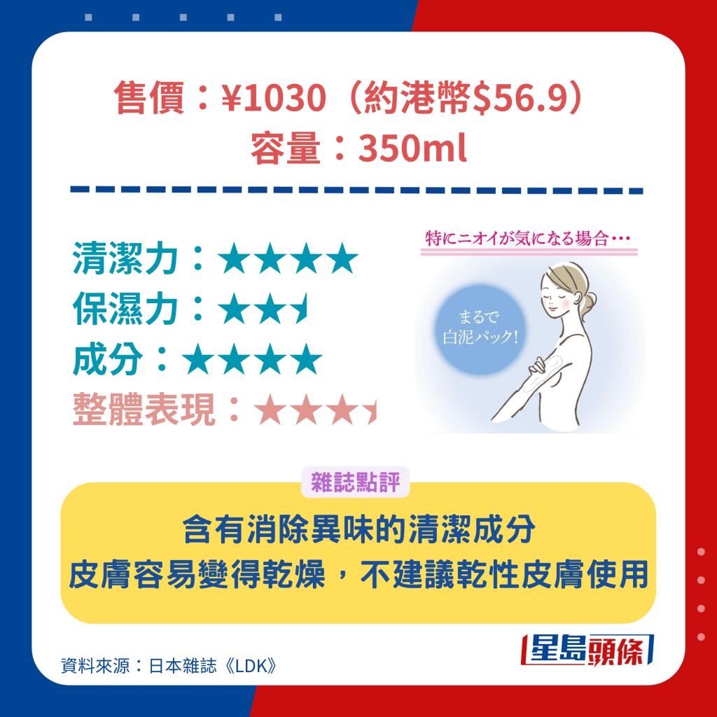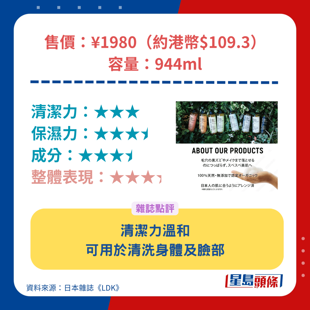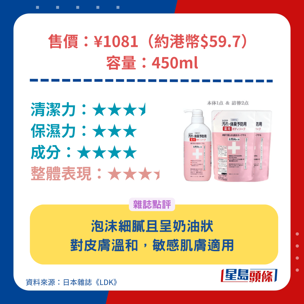 日本知名家品雜志《LDK》就清潔力、保濕力以及成分3大評分準(zhǔn)則,評測巿面上17款平價沐浴露。