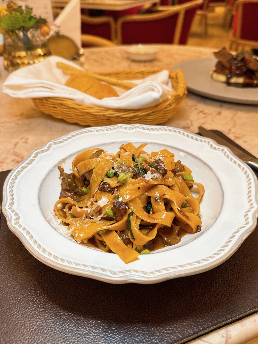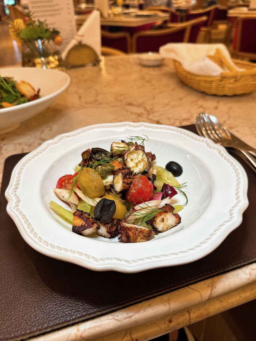 是日自選四道菜午市套餐(人均消費(fèi)約220元人民幣),前菜大蝦沙律沿用肉厚清甜彈牙的鮮虎蝦入饌,簡(jiǎn)單香煎便散發(fā)食材自身鮮味,配合火箭菜和自家調(diào)制的芥末蜜桃汁,微絲甜澀,風(fēng)味清新。至于八爪魚(yú)沙律,八爪魚(yú)肉質(zhì)不失細(xì)嫩而香氣十足,佐以風(fēng)味各異的紅黃兩色車(chē)?yán)宸眩t色番茄軟身多汁,而黃色的質(zhì)感爽口,配合風(fēng)味醇厚的黑橄欖、小酸豆,并以味道濃郁、咸香十足的鯷魚(yú)柳汁提味。接下來(lái)的粟米湯以Baby Corn迷你粟米配搭鮮肉米濃湯,前者微絲香甜而味道淡雅,后者味道鮮甜而質(zhì)感細(xì)滑,天然風(fēng)味可想而知。至于期待的主菜自家制Fettuccine意大利寬面配Oxtail Ragout燴牛尾,傳統(tǒng)肉汁精煉厚實(shí),香草肉味香濃,然而醬汁出奇地甜,從服務(wù)員口中得悉,這是豌豆自身的獨(dú)特蜜甜。接下來(lái)的伊比利亞黑毛豬頸肉更見(jiàn)出色,橡果飼養(yǎng)的走地黑毛豬頸肉油脂肉汁豐富,且馀韻香甜濃郁,隨附的薯蓉質(zhì)感豐盛細(xì)滑。