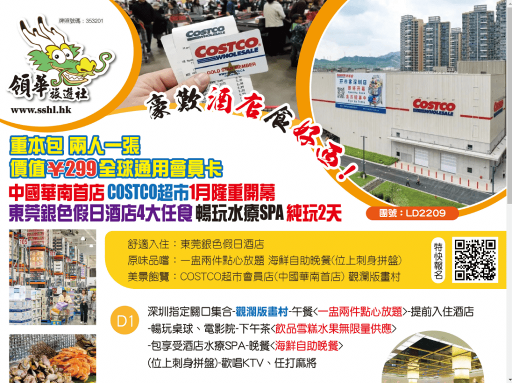 領(lǐng)華亦有推出另外一個(gè)以圳Costco開巿客掃貨的旅行團(tuán),行程包水療SPA、麻將等,食足3餐,團(tuán)費(fèi)就較貴需399元。領(lǐng)華網(wǎng)頁截圖