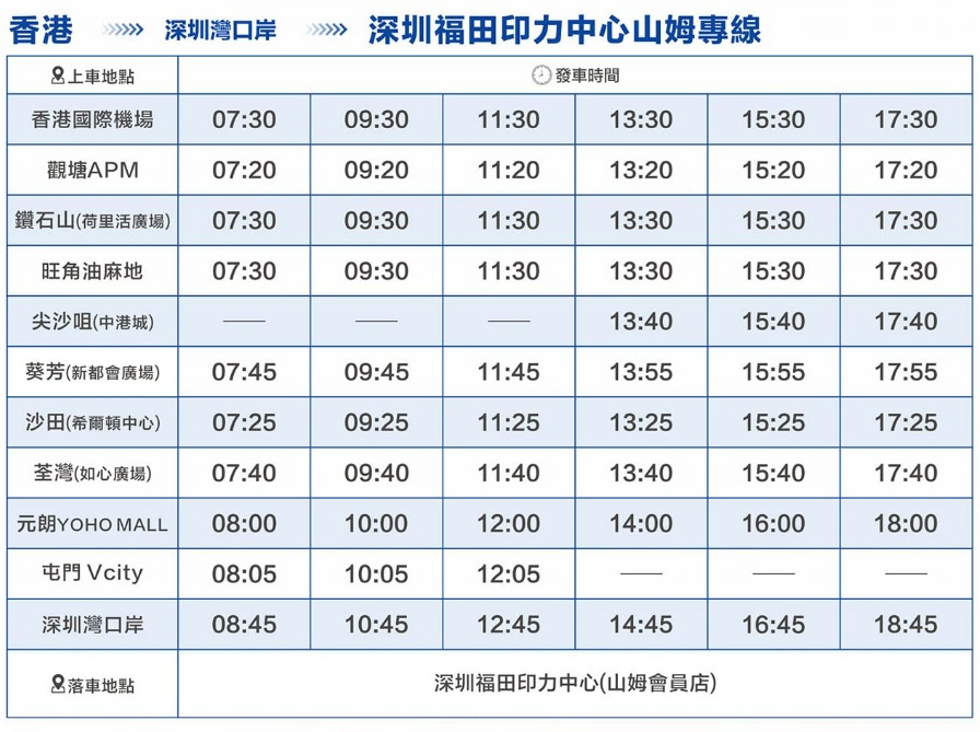 1. 香港市區(qū)經(jīng)深圳灣口岸去深圳福田印力中心(山姆專(zhuān)線)