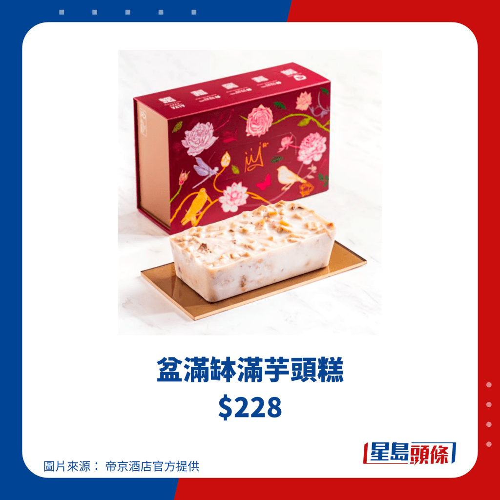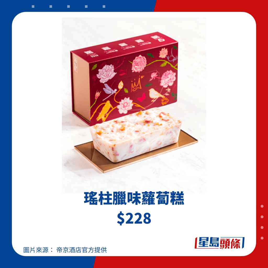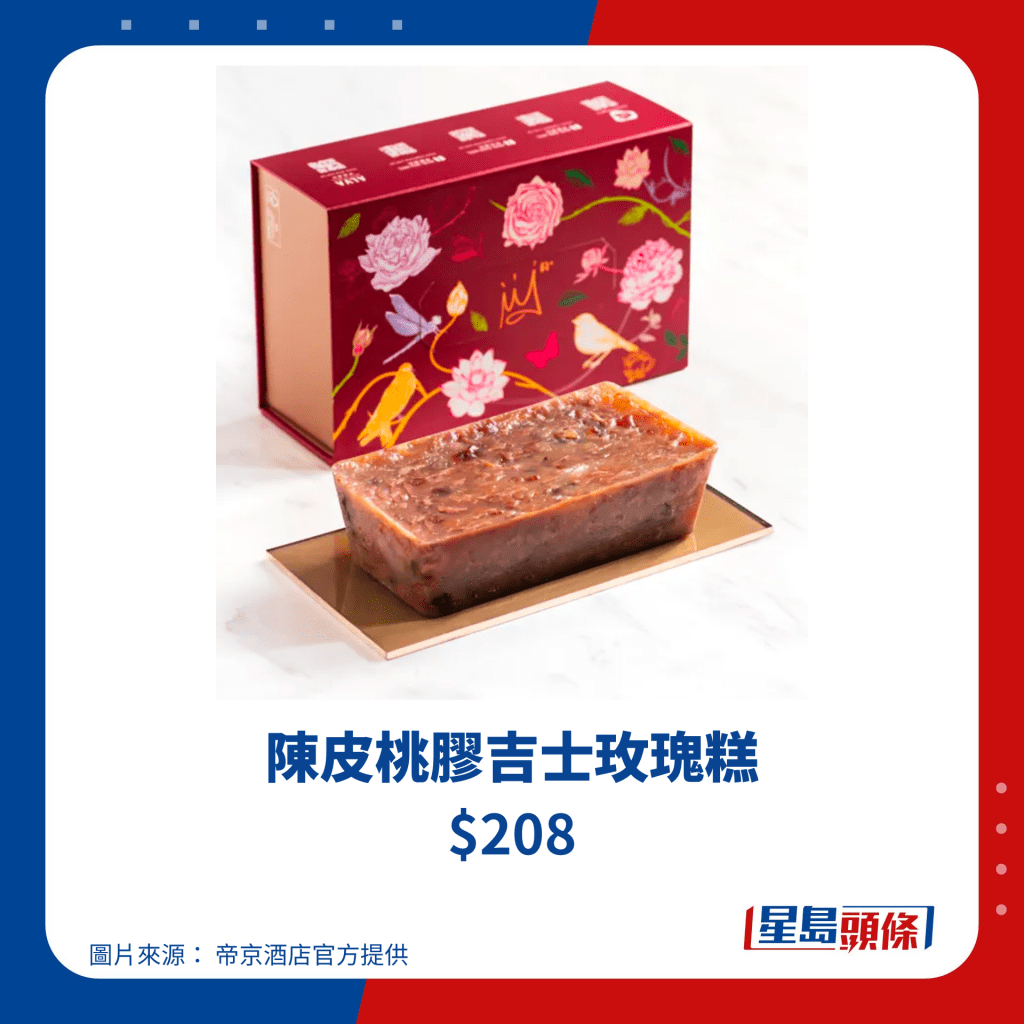 帝港酒店集團(tuán)旗下共有四間酒店,包括帝都酒店、帝景酒店、帝逸酒店及帝京酒店,今個新年除了推出他們多年來的經(jīng)典瑤柱臘味蘿卜糕、桂圓金箔棗皇糕、芋頭糕之外,更全新推出陳皮桃膠吉士玫瑰糕,選用遠(yuǎn)年陳皮,配以“平民燕窩”桃膠,適合一眾女士養(yǎng)顏補(bǔ)身,于2024年1月12日或之前訂購賀年糕點(diǎn),更可享85折優(yōu)惠,送禮自用也不錯。