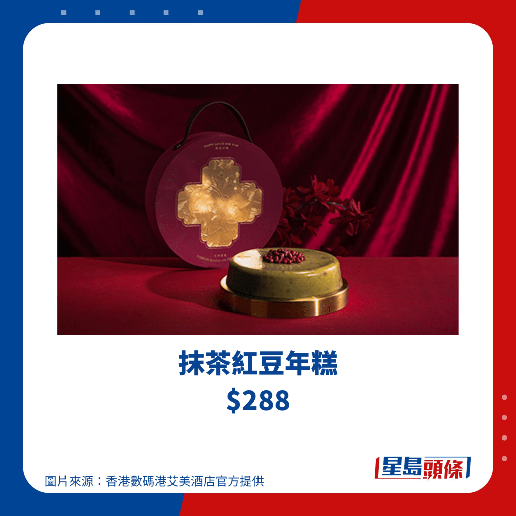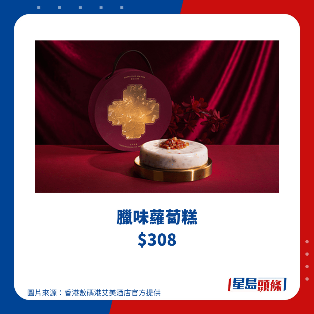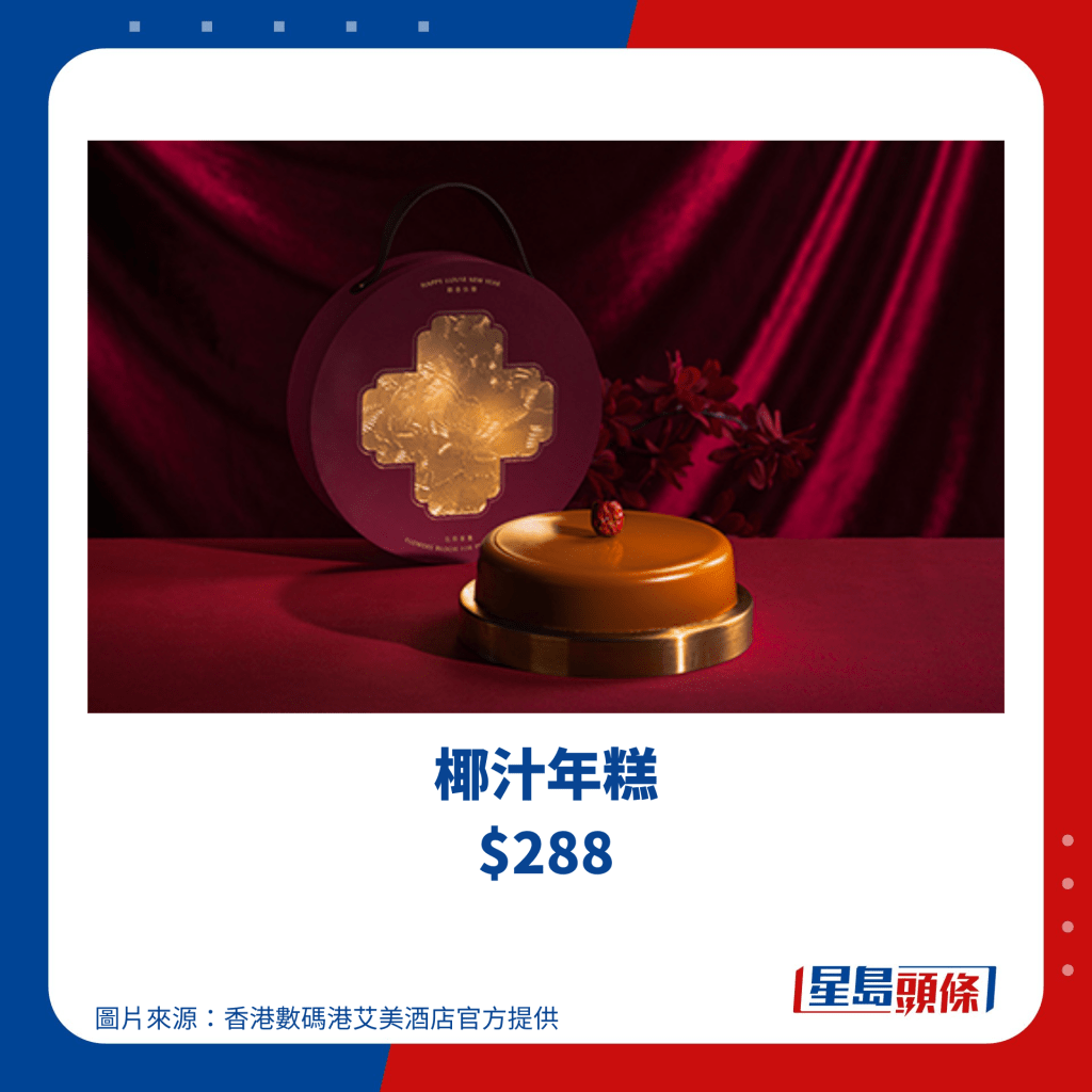 香港數(shù)碼港艾美酒店位于香港島南區(qū),酒店的中菜廳南坊今個新年也推出新春賀年糕點(diǎn),糕點(diǎn)禮盒設(shè)計特別,圓盒外型恍如古代錢幣,選用紫紅色調(diào),禮盒上方更有手挽,各位女士可以用作可愛小手袋,而賀年糕點(diǎn)則共有3款選擇,包括椰汁年糕、臘味蘿卜糕及抹茶紅豆年糕,由即日至2024年1月14日期間預(yù)訂,可享75折優(yōu)惠。