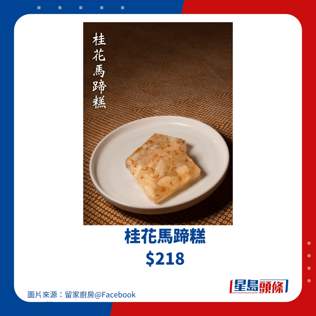 “留家廚房”立店于灣仔軒尼詩道,小店曾獲米其林一星及榮登WOM飲食指南的十大最佳中菜,以私房菜格局,為食客呈上天然無味精而味道純正的傳統(tǒng)粵式菜,其賀年糕點(diǎn)也是港人每年熱門購買之選!今年2024年推出4款賀年糕點(diǎn),包括選用本地蘿卜及臘肉臘腸制作的“八鄉(xiāng)蘿卜糕”; “棕櫚糖年糕”以棕櫚樹花汁慢火熬煮成棕櫚糖,帶焦糖椰香味; “紅棗椰汁糕”選用有機(jī)灰棗,兩層紅棗糕夾著椰汁糕,口感軟滑煙韌; “桂花馬蹄糕 ”選用新鮮手摘不落地金桂花,零人工添加糖釀,保留天然桂花香,每一款均由香港制造,無味精及防腐劑,值得支持!