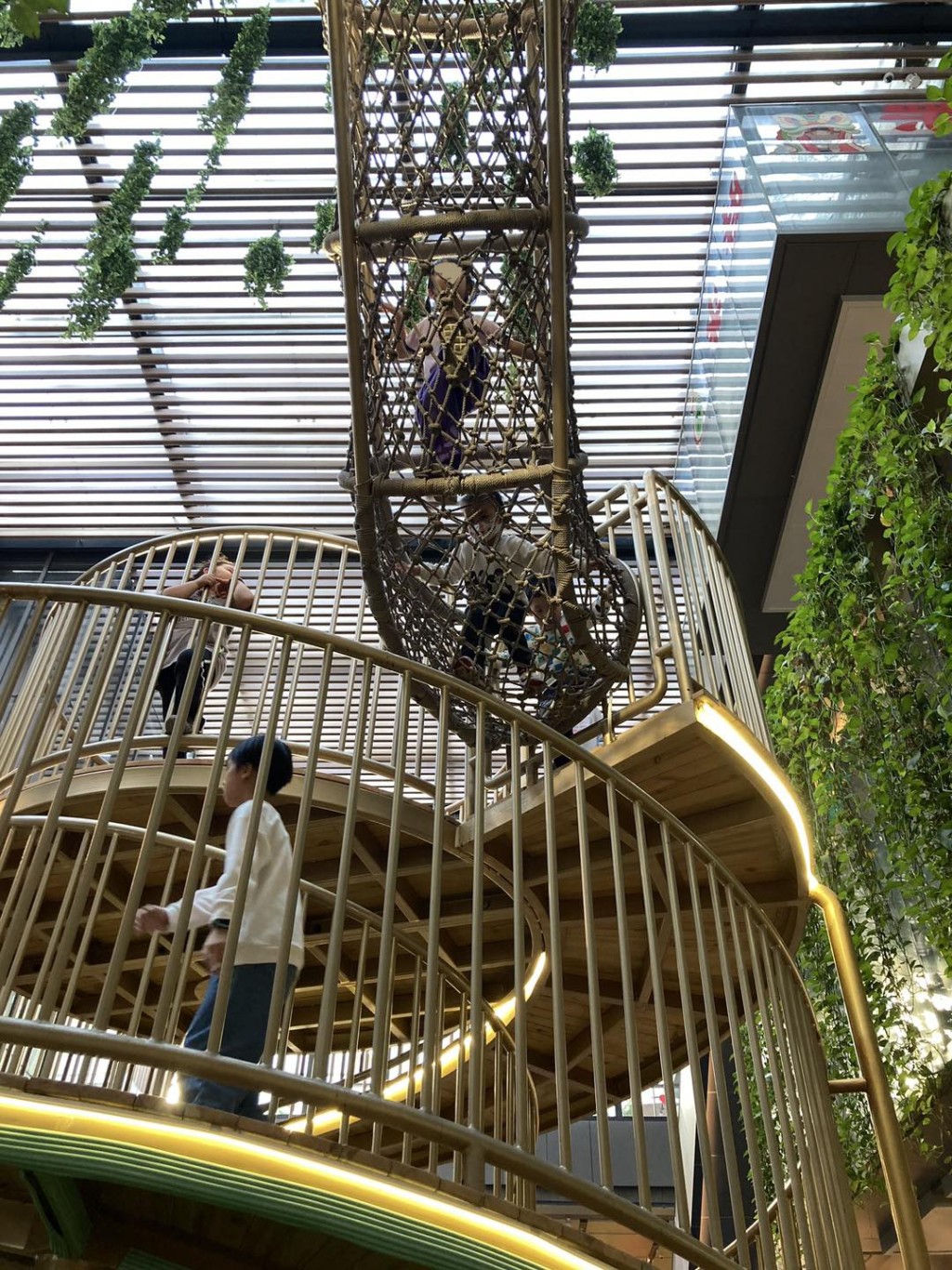 華僑城OCT PARK歡樂時(shí)光是深圳首個(gè)集休閑、社交、教育、餐飲、運(yùn)動(dòng)5大主題定位的一站式高品位生活中心,商場的2、3樓有一個(gè)名為“懸浮森林”的游樂設(shè)施,雖然未算超大型,但也足夠陪爸媽逛街逛得悶了的孩子,在這里放電一會(huì)兒。 小朋友可于3樓的小樹屋通過滑梯滑至2樓的草坪樂園,亦可以由走進(jìn)2樓的旋轉(zhuǎn)棧道,再穿過繩索通道爬回3樓的樹屋,豬仔包一到即走上走落,媽媽就待在繩索通道出口等孩子回來,乘機(jī)可抖抖。游樂設(shè)施以森林做主題,更有4米高長頸鹿做裝飾,四處也有植物景觀,還有葉子造型休息椅,來這兒小休一會(huì),打打卡也是樂事。
