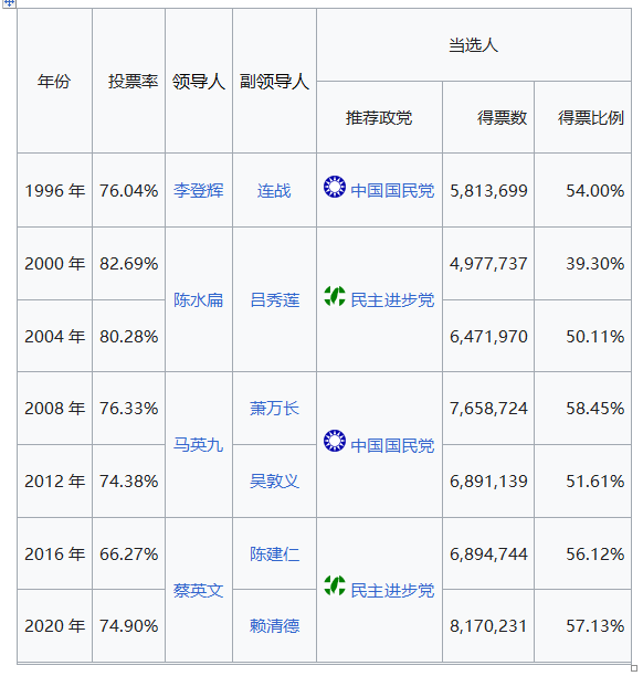 臺(tái)灣的領(lǐng)導(dǎo)人直選列表