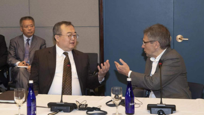 ▲劉建超在對(duì)話會(huì)上和歐亞集團(tuán)總裁布雷默見(jiàn)面。