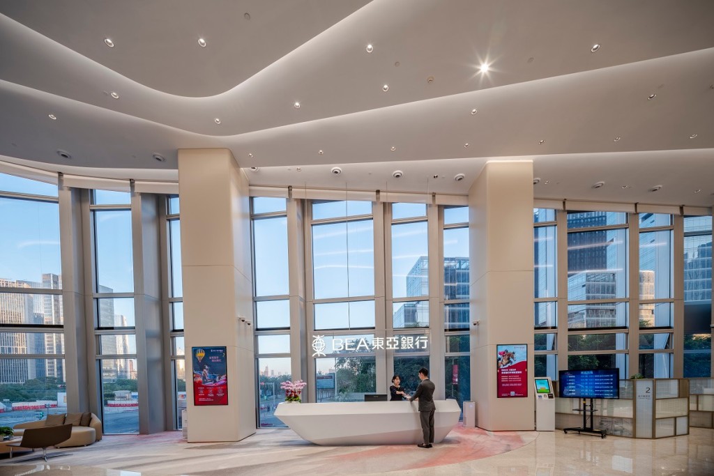 ▲據(jù)介紹,前海東亞大廈有天花板、內(nèi)牆運(yùn)用偏白色調(diào)為主,以增加采光效能同時(shí)減少耗電。伴隨著品牌煥新,而一樓大堂主色由傳統(tǒng)紅色變?yōu)榘咨?/span>