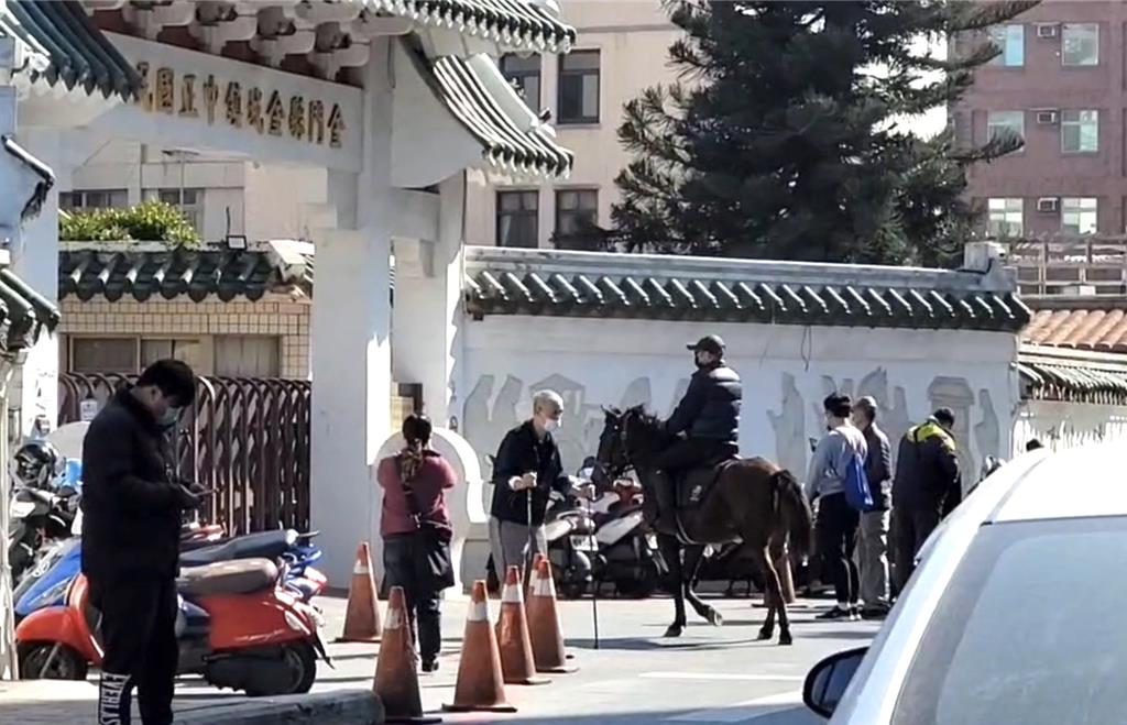 ▲金門一名王姓男子騎馬出現(xiàn)在投開票所前準(zhǔn)備投票,吸引民眾目光。