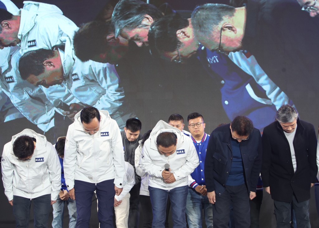 ▲侯友宜(中)和副手搭檔趙少康(右二)、黨主席朱立倫(左二)與選舉團(tuán)隊(duì)上臺(tái)向所有的民眾鞠躬致意。中國時(shí)報(bào)
