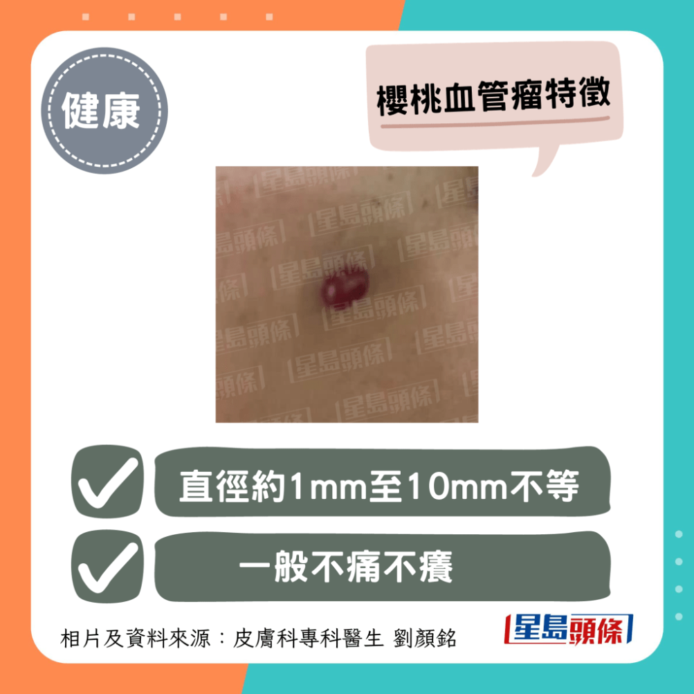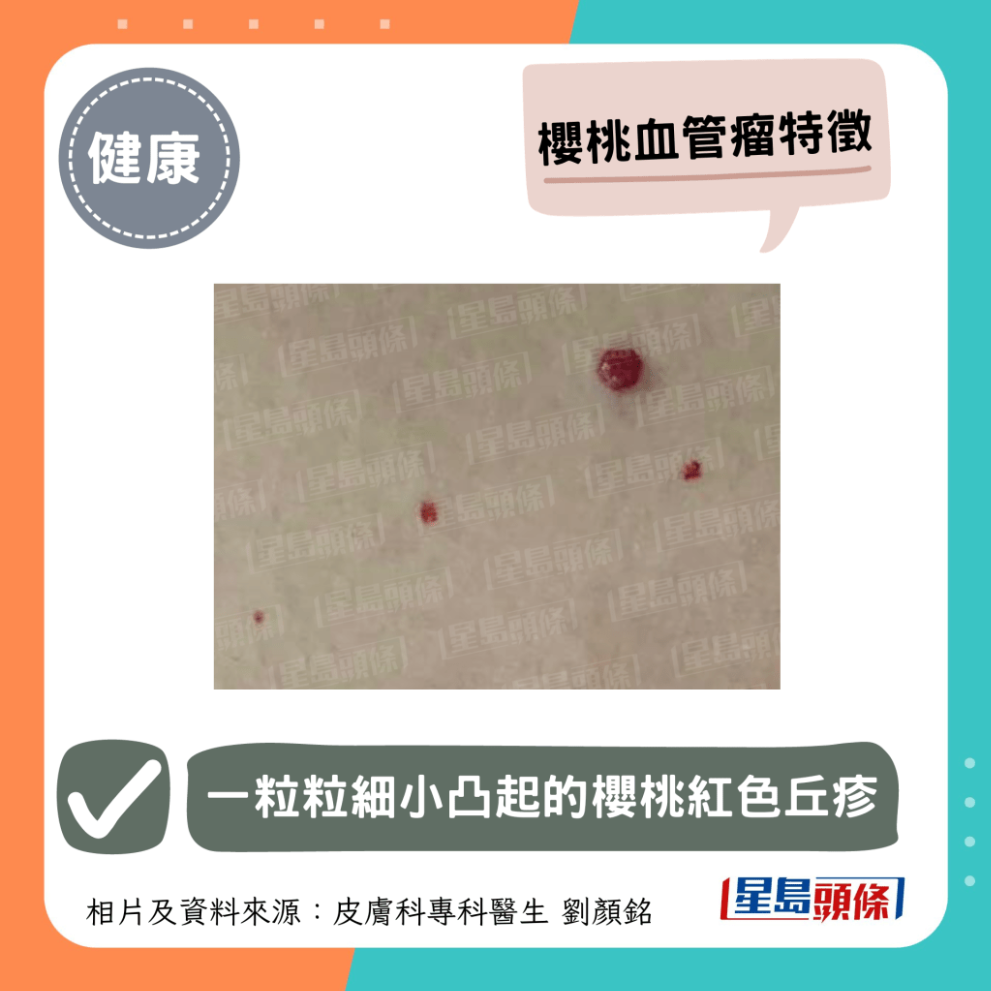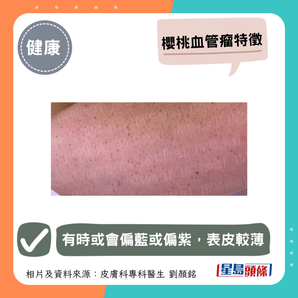 劉醫(yī)生指出,櫻桃血管瘤可以出現(xiàn)在身體任何地方,尤其是面頸、手臂、大腿、胸腹、背部等,但較少長(zhǎng)在手掌、腳掌、黏膜組織上,患處呈現(xiàn)為一粒粒細(xì)小凸起的櫻桃紅色丘疹,有時(shí)或會(huì)偏藍(lán)或偏紫,表皮較薄,直徑大約1mm至10mm不等,一般不痛不癢,但若不小心抓損時(shí),流血量會(huì)比平常多。