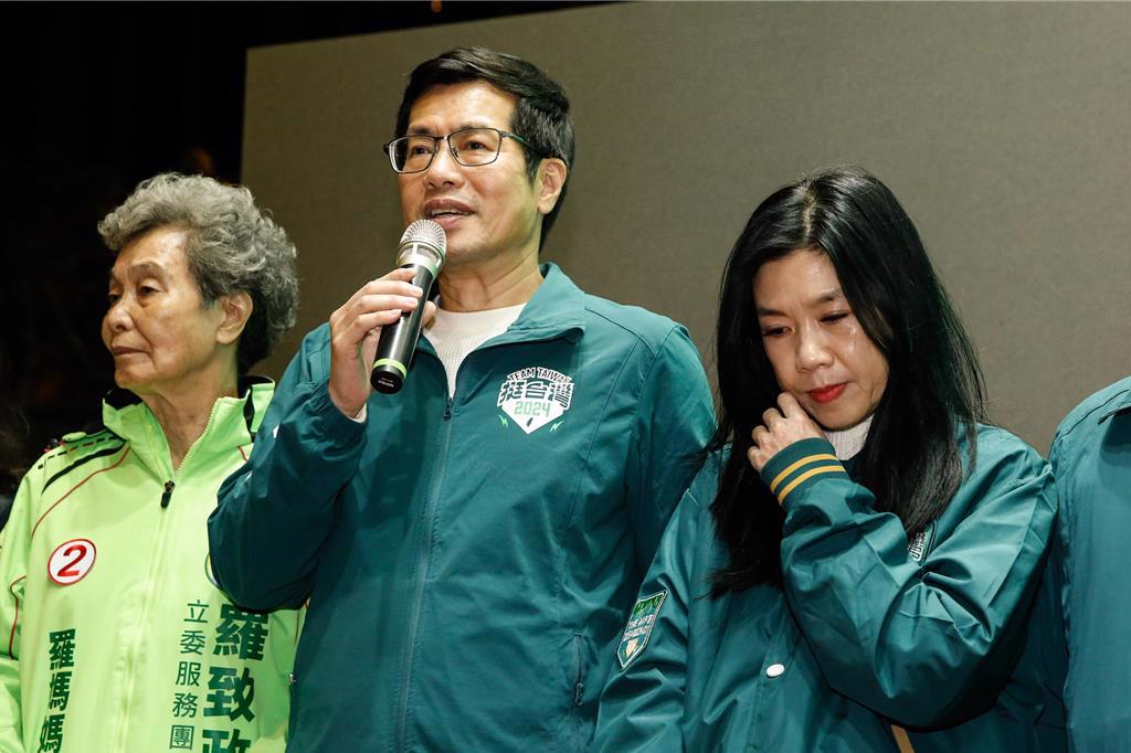 民進黨“立委”羅致政(中)尋求連任失利,13日晚間與家人及競選團隊向支持者鞠躬致意。