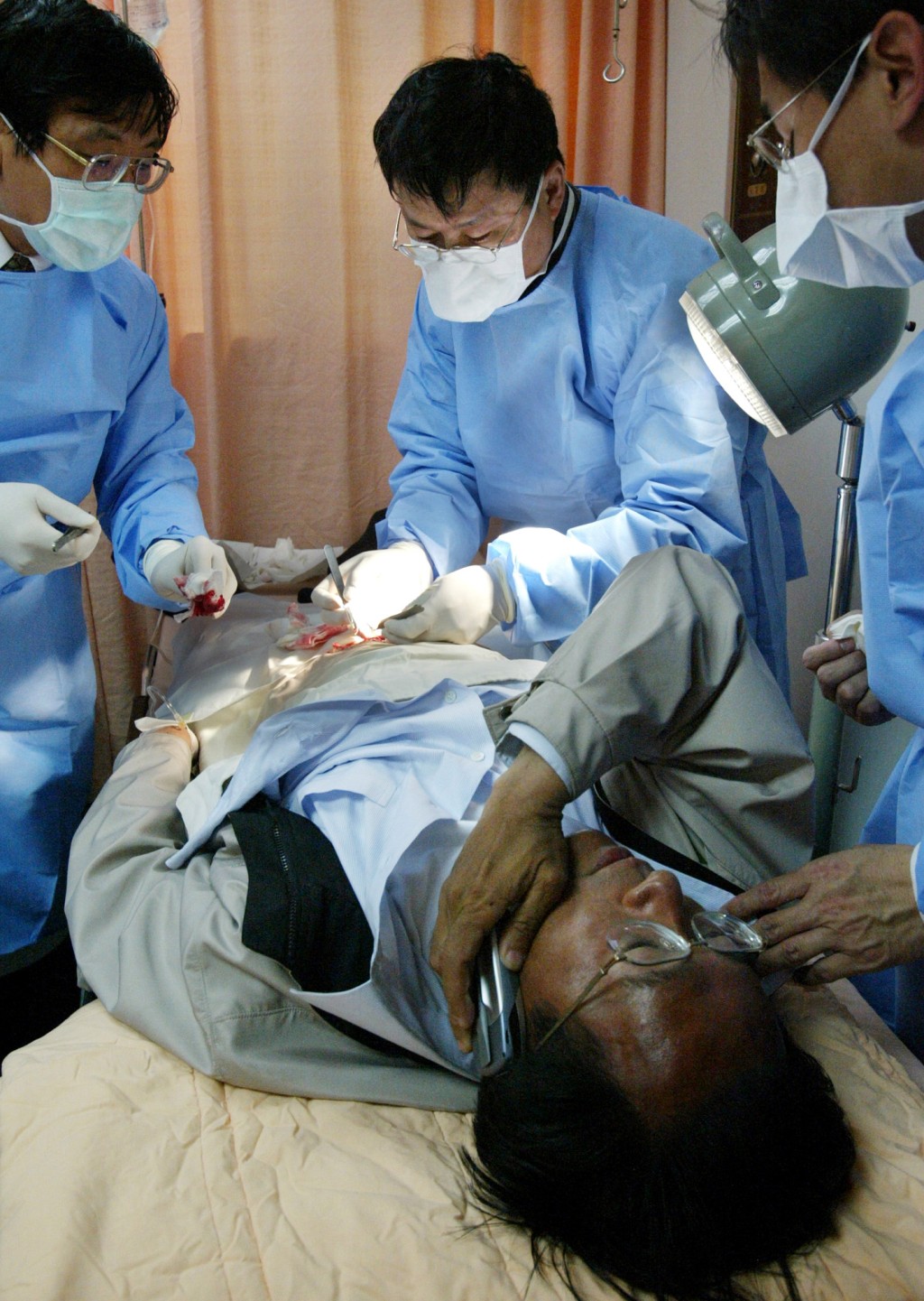 陳水扁腹部中槍后,邊縫針邊講電話。美聯(lián)社