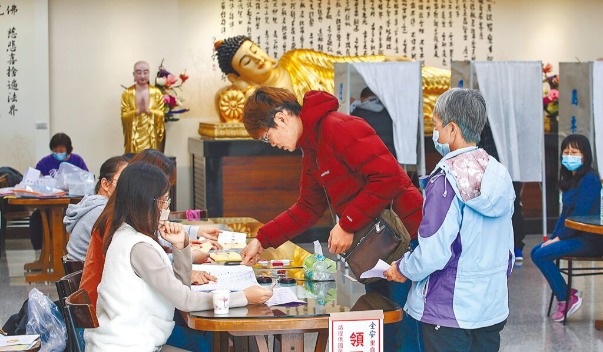 選民在新莊區(qū)佛光山擇善寺投開票所如來臥佛前投票。