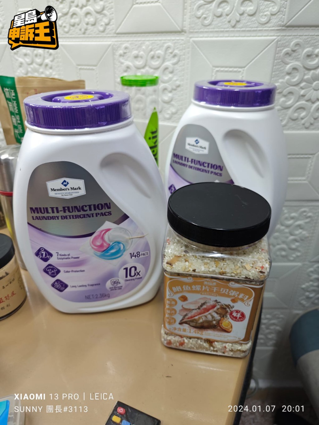 Sunny在山姆搶購了多鮑魚干貝蝦仁粥(相中黑色瓶蓋產(chǎn)品),但進(jìn)食時(shí)發(fā)現(xiàn)沒有味道; 另外亦搶購了多瓶洗衣珠(相中紫色蓋產(chǎn)品),后來發(fā)現(xiàn)香港藥房售價(jià)比山姆,每粒洗衣珠只便宜3毫。 (受訪者提供圖片)