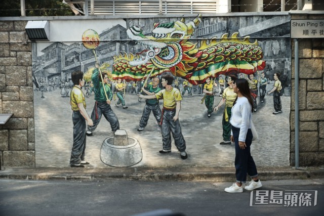 位于舊消防局附近的順平街街名寓意“順利平安”,墻身繪上兩幅壁畫,描繪沙頭角傳統(tǒng)的酬神慶典活動“天后醮典”,沙頭角居民每年都會按傳統(tǒng)舉行天后誕,當(dāng)中最具特色的就是鶴佬婦女的“陸上龍舟”舞,光看壁畫都可以感受熱鬧氣氛!