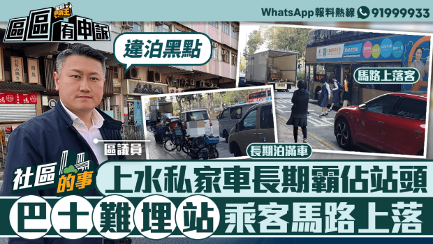 違例泊車,不但阻塞交通,更會對道路使用者造成不便。有北區(qū)街坊稱,上水石湖墟一個巴士站,經(jīng)常被私家車和貨車霸占,令到巴士無法正常埋站,除了乘客上落車險象環(huán)生,有輪椅客更因此無法上車。區(qū)議員指出,該處是違泊黑點,建議安裝攝錄鏡頭,以減少違泊情況。