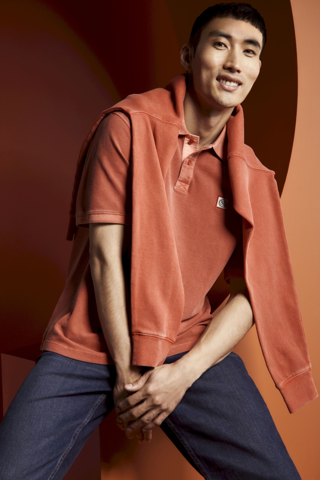 ▲橙色純棉Polo衣/$299、復(fù)古洗水牛仔褲/$449/M,選購(gòu)男裝褲款2件或以上有8折。