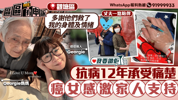 Georgie透過病人組織《癌癥信息網(wǎng)》撰文予“我要贊佢”,感激在抗癌路上,一直有身邊親人及朋友的陪伴,尤其是經(jīng)歷喪夫之痛不久的媽媽,又面對女兒患病,心情肯定相當(dāng)難受,但也伴她同哭同笑。